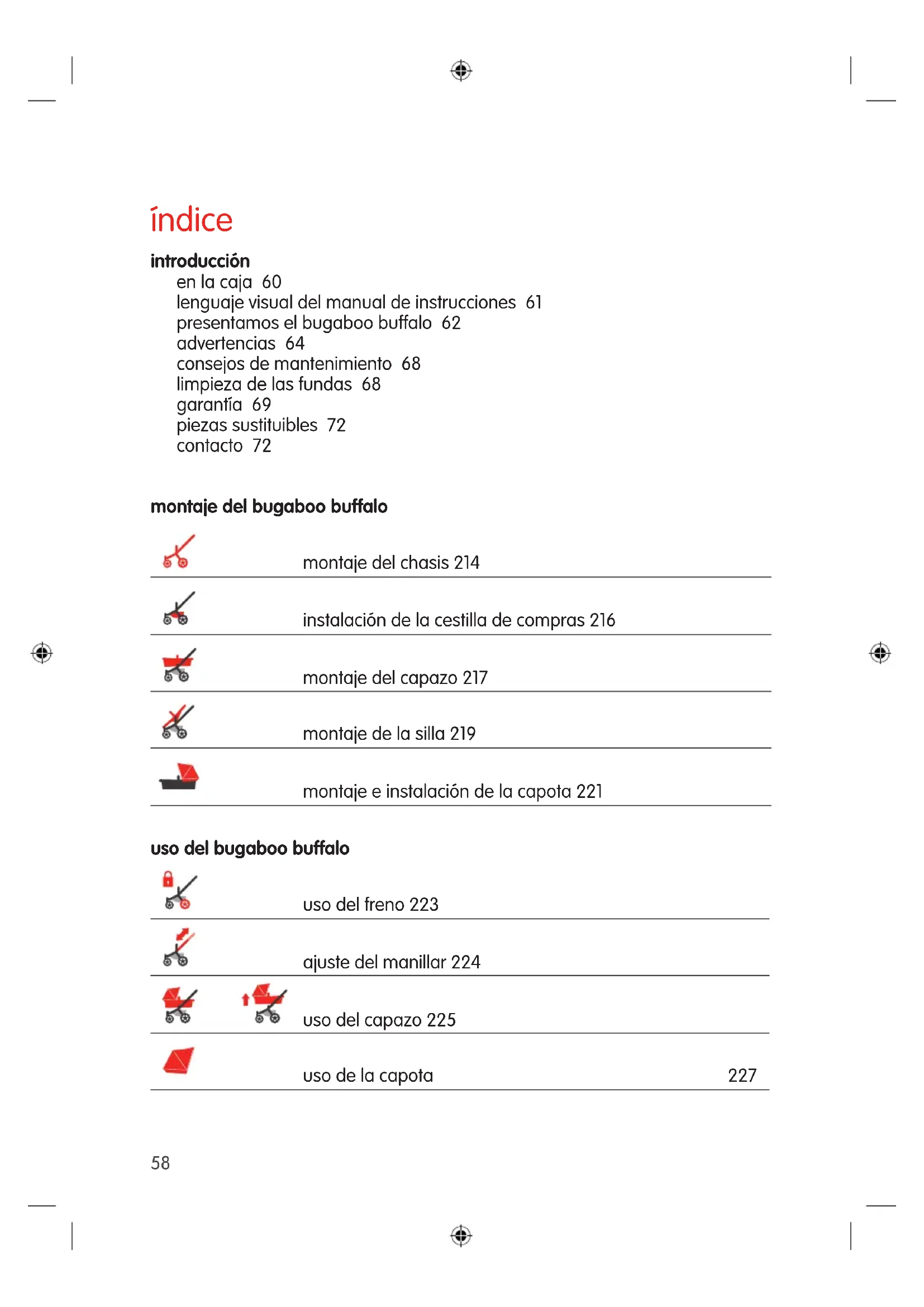 TRíndice introducción en la caja 60 lenguaje visual del manual de instrucciones 61 presentamos el bugaboo buffalo 62 advertencias 64 consejos de mantenimiento 68 limpieza de las fundas 68 garantía 69 piezas sustituibles 72 contacto 72 montaje del bugaboo buffalo montaje del chasis 214 instalación de la cestilla de compras 216 montaje del capazo 217 montaje de la silla 219 montaje e instalación de la capota 221 uso del bugaboo buffalo uso del freno 223 ajuste del manillar 224 uso del capazo 225 uso de la capota 227