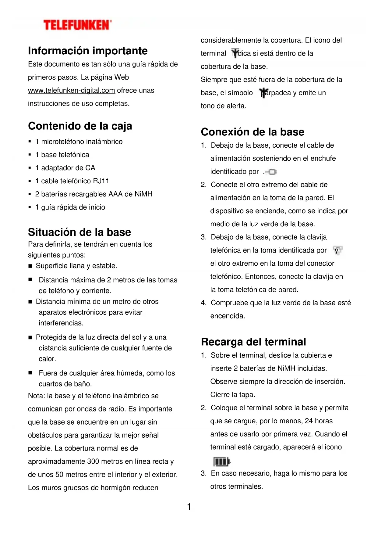 723 Rue de Bois Breteau 16170 ROUILLAC FRANCEESPAÑOL1 Información importante Este documento es tan sólo una guía rápida de primeros pasos. La página Web www.telefunken-digital.com ofrece unas instrucciones de uso completas. Contenido de la caja 1 microteléfono inalámbrico 1 base telefónica 1 adaptador de CA 1 cable telefónico RJ11 2 baterías recargables AAA de NiMH 1 guía rápida de inicio Situación de la base Para definirla, se tendrán en cuenta los siguientes puntos: Superficie llana y estable.