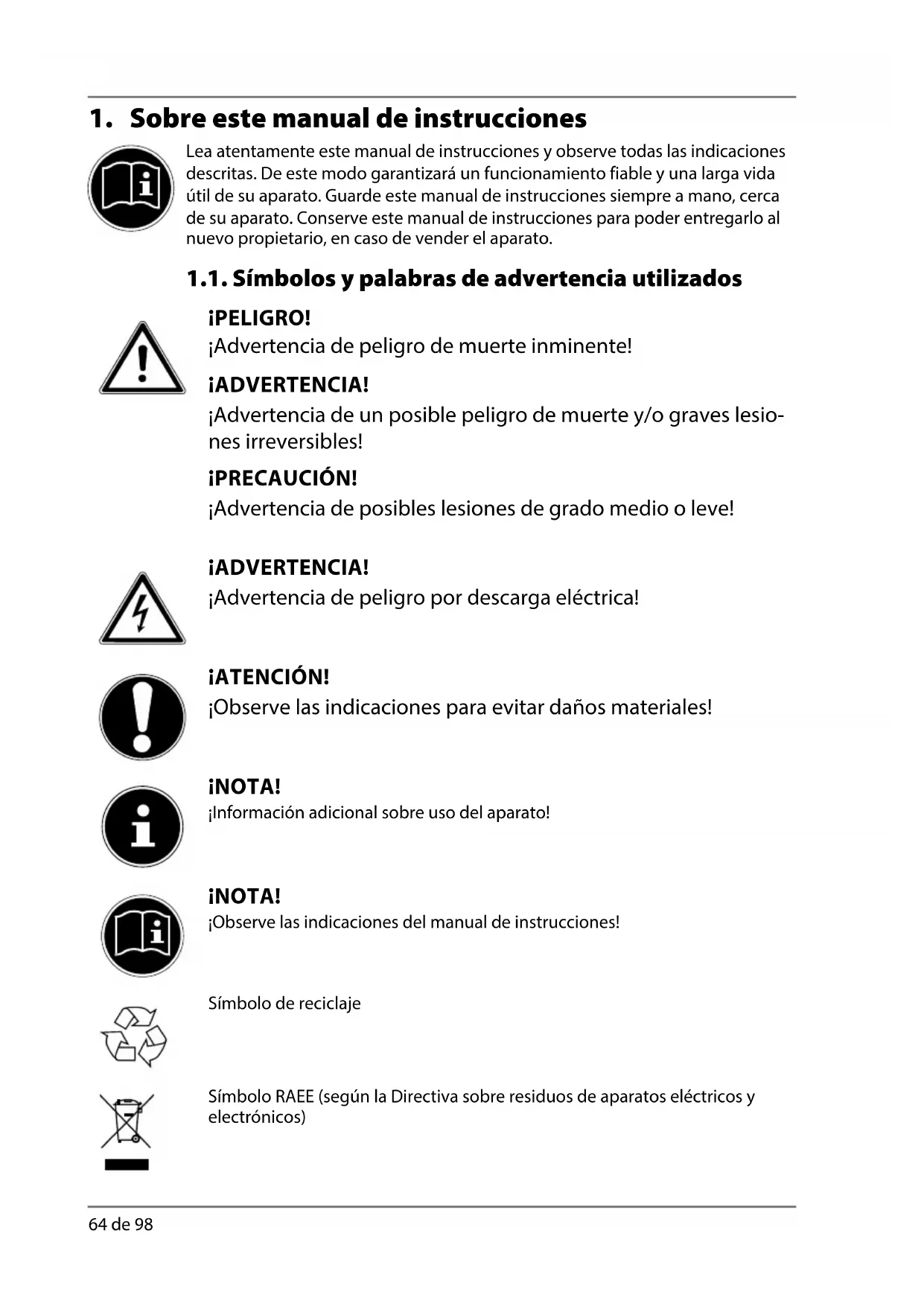 Lea atentamente este manual de instrucciones y observe todas las indicaciones descritas. De este modo garantizará un funcionamiento fiable y una larga vida útil de su aparato. Guarde este manual de instrucciones siempre a mano, cerca de su aparato. Conserve este manual de instrucciones para poder entregarlo al nuevo propietario, en caso de vender el aparato. 1.1. Símbolos y palabras de advertencia utilizados ¡PELIGRO! ¡Advertencia de peligro de muerte inminente! ¡ADVERTENCIA! ¡Advertencia de un posible peligro de muerte y/o graves lesio- nes irreversibles! ¡PRECAUCIÓN! ¡Advertencia de posibles lesiones de grado medio o leve! ¡ADVERTENCIA! ¡Advertencia de peligro por descarga eléctrica! ¡ATENCIÓN! ¡Observe las indicaciones para evitar daños materiales! ¡NOTA! ¡Información adicional sobre uso del aparato! ¡NOTA! ¡Observe las indicaciones del manual de instrucciones! Símbolo de reciclaje Símbolo RAEE (según la Directiva sobre residuos de aparatos eléctricos y electrónicos)DE