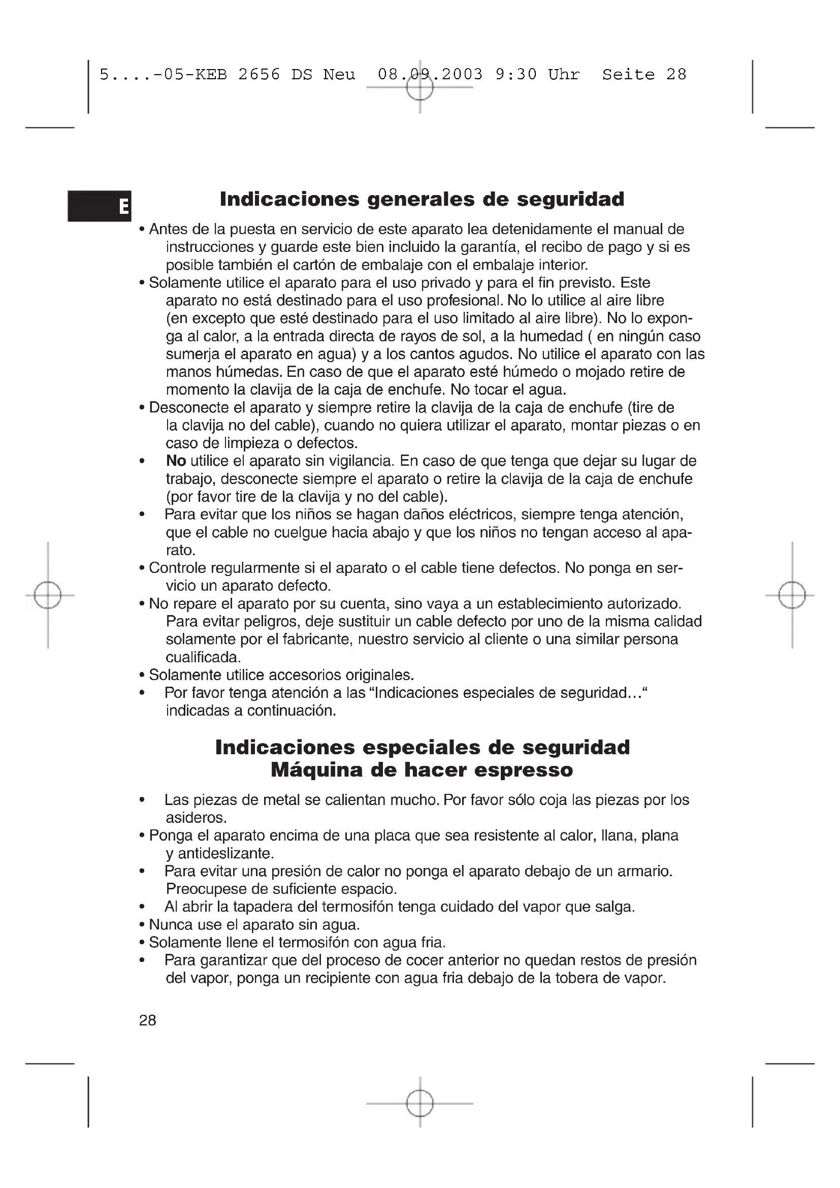 A Tapa enganchada del depósito de agua B Interruptor conexión/descone- xión C Portafiltro giratorio D Jarra de cristal E Placa calentadora con control termoestático Cafetera exprés/capuchino a Tapa del depósito de agua b Interruptor conexión/desconexión para cafetera exprés/capuchino c Interruptor selector de intensidad del exprés d Botón de control del vapor e Tobera de vapor f Portafiltro g Filtro de metal h Jarra de vidrio con asidero y tapa i Rejilla de protección antiderrame j Dispositivo adaptador para 2 tasas Café filtro exprés/capuchino 5....-05-KEB 2656 DS Neu 08.09.2003 9:30 Uhr Seite 29todas las piezas sueltas en agua de jabón caliente, enjuáguelas bien con agua clara y séquelas. Deje que el aparato funcione una vez sin polvo de café según las instrucciones de uso. Atención - la cafetera exprés genera presión Durante el funcionamiento el depósito de agua está bajo presión. Por eso no olvi- de: sólo abra la tapa (a) o el portafiltro cuando el depósito de agua ya no está bajo presión. A estos efectos, observe las instrucciones para determinar si el aparato todavía se encuentra bajo presión. Por favor observe las siguientes advertencias de seguridad durante el funcionamiento y unos 15 minutos después de su uso: