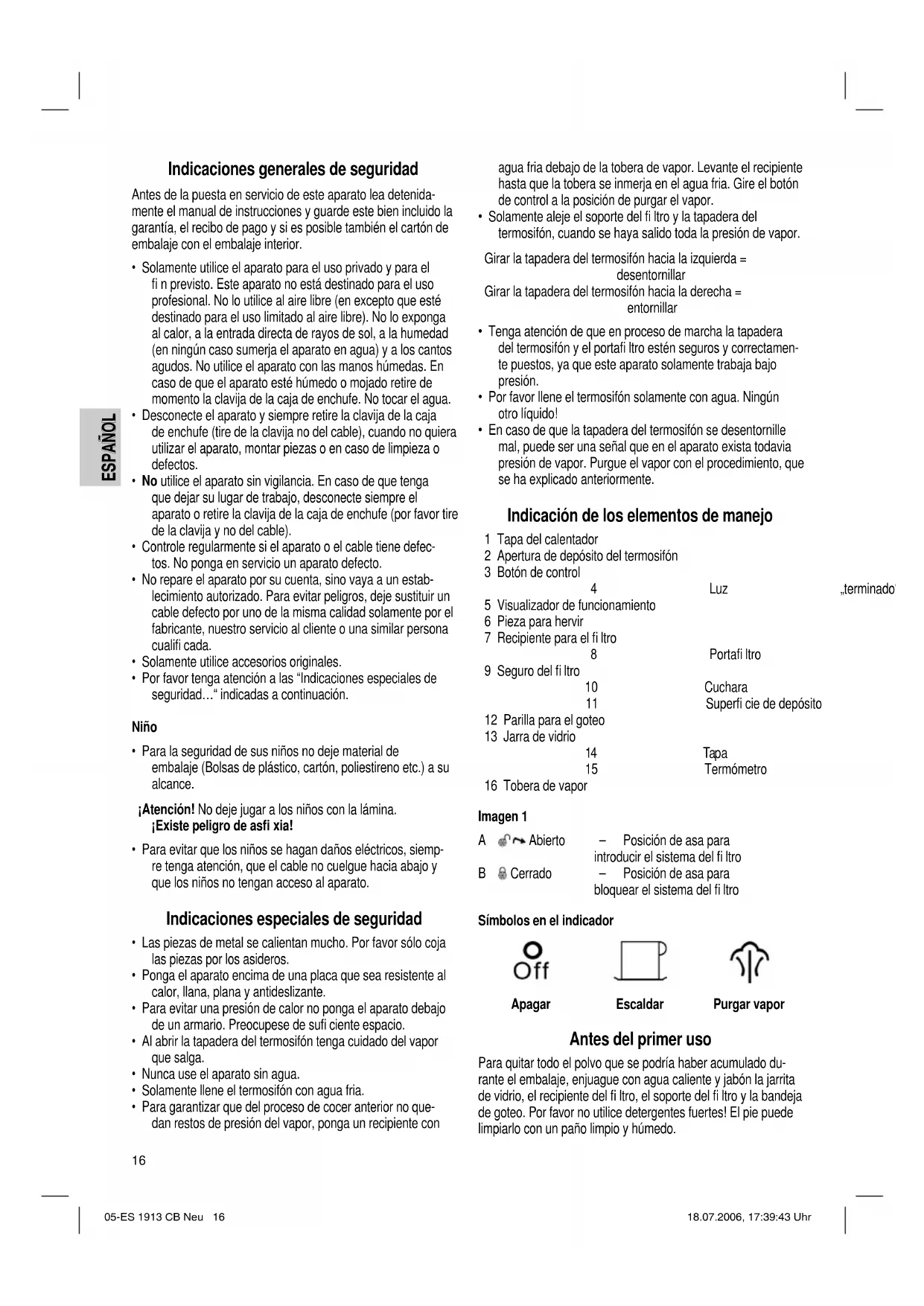 - En caso de que la tapadera del termosifón se desentornille mal, puede ser una señal que en el aparato exista todavia presión de vapor. Purgue el vapor con el procedimiento, que se ha explicado anteriormente. Indicación de los elementos de manejo 1 Tapa del calentador 2 Apertura de depósito del termosifón 3 Botón de control 4 Luz „terminado“ 5 Visualizador de funcionamiento 6 Pieza para hervir 7 Recipiente para el fi ltro 8 Portafi ltro 9 Seguro del fi ltro 10 Cuchara 11 Superfi cie de depósito 12 Parilla para el goteo 13 Jarra de vidrio 14 Tapa 15 Termómetro 16 Tobera de vapor Imagen 1 A Abierto – Posición de asa para introducir el sistema del fi ltro B Cerrado – Posición de asa para bloquear el sistema del fi ltro Símbolos en el indicador Apagar Escaldar Purgar vapor Antes del primer uso Para quitar todo el polvo que se podría haber acumulado du- rante el embalaje, enjuague con agua caliente y jabón la jarrita de vidrio, el recipiente del fi ltro, el soporte del fi ltro y la bandeja de goteo. Por favor no utilice detergentes fuertes! El pie puede limpiarlo con un paño limpio y húmedo. 05-ES 1913 CB Neu 16 18.07.2006, 17:39:43 UhrESPAÑOL