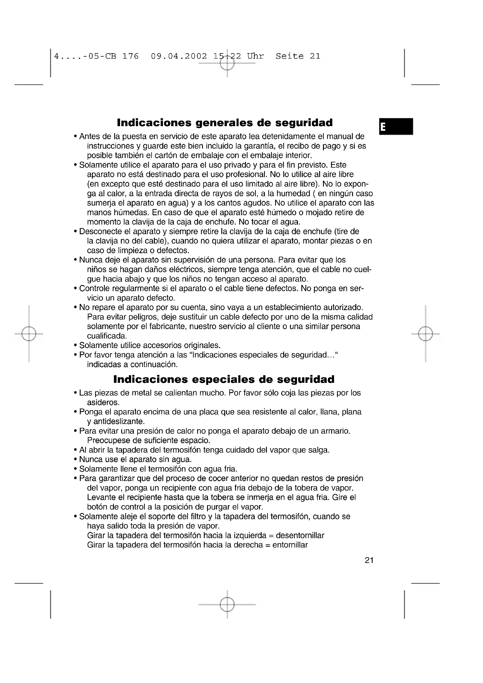 4....-05-CB 176 09.04.2002 15:22 Uhr Seite 24nes de uso del fabricante). Siga los puntos como explicado en “Preparación de espresso“, pero no llene el recipiente con polvos de café! Después de la des- calcificación deje pasar de 2 a 3 veces agua fría por la máquina. Limpieza y mantenimiento