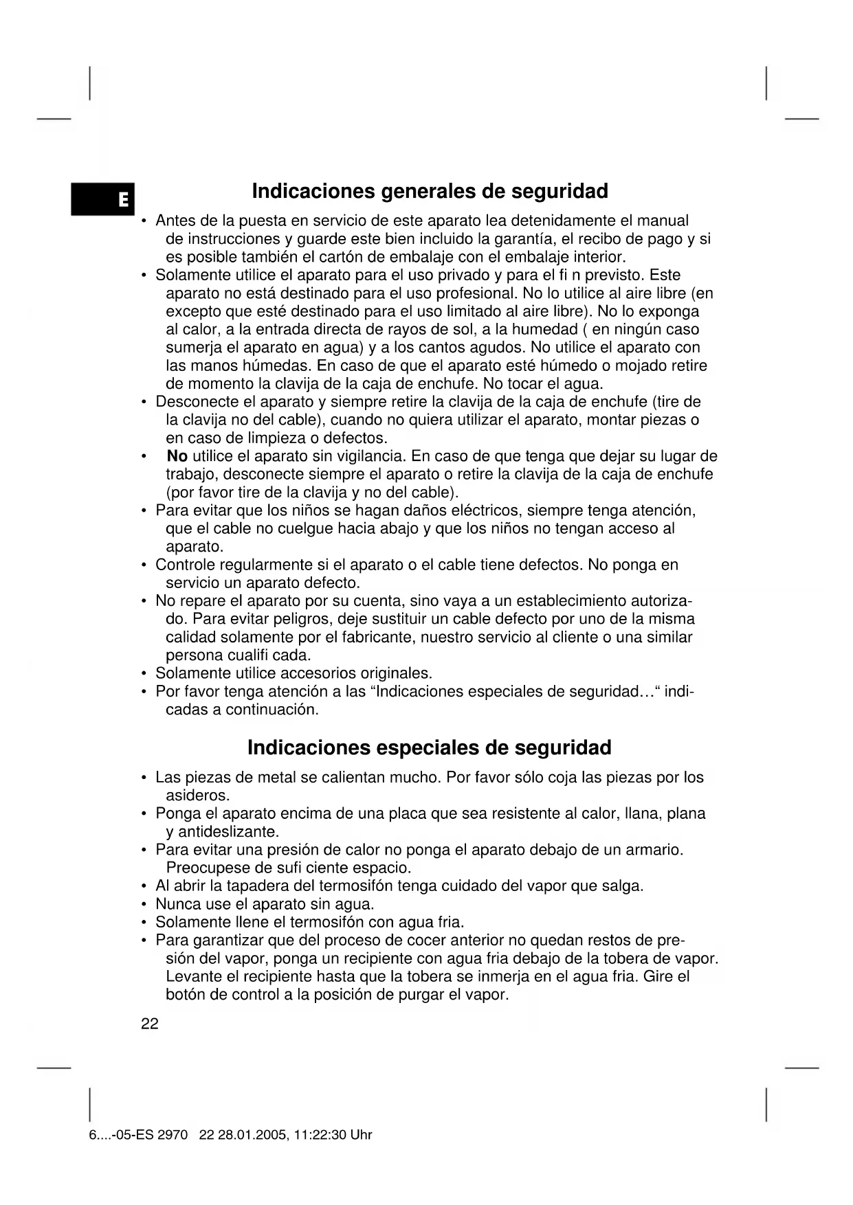 - En caso de que la tapadera del termosifón se desentornille mal, puede ser una señal que en el aparato exista todavia presión de vapor. Purgue el vapor con el procedimiento, que se ha explicado anteriormente. Indicación de los elementos de manejo 1Tapadera del termosifón12Parilla para el goteo 2 Apertura de depósito del termosifón 13 Base 3 Botón de control 14 Hervir 4 Termosifón 15 Salida de vapor 5 Visualizador de funcionamiento 16 Desconectado 6 Pieza para hervir 17 Tubito de vapor 7 Recipiente para el fi ltro 18 Tobera de vapor 8 Portafi ltro 19 Abierto – Posición de asa para 9 Seguro del fi ltro introducir el sistema del fi ltro 10 Asa del fi ltro 20 Cerrado – Posición de asa 11 Boquilla del fi ltro para bloquear el sistema del fi ltro Antes del primer uso Para quitar todo el polvo que se podría haber acumulado durante el embalaje, enjuague con agua caliente y jabón la jarrita de vidrio, el recipiente del fi ltro, el soporte del fi ltro y la bandeja de goteo. Por favor no utilice detergentes fuertes ! El pie puede limpiarlo con un paño limpio y húmedo. Tenga atención de estas indicaciones de seguridad! Antes de iniciar la primera cocción de espresso o café, le recomendamos que realice una cocción completa sin polvos de café como explicado bajo „Prepara- ción de espresso“. Así se garantiza que todo el polvo que haya cogido la máquina sea quitado. La preparación de espresso y cappuccino es diferente que la de café normal. El espresso igual que el cappuccino se preparan apretando bajo presión el agua cocida en el café molido. Para esto es necesario un poco de atención y le recomendamos leer detenidamente todas las instrucciones y indicaciones de seguridad antes de empezar a cocer. 6....-05-ES 2970 23 28.01.2005, 11:22:30 UhrE