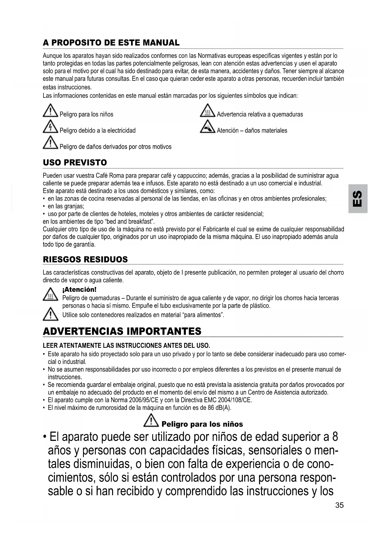 Aunque los aparatos hayan sido realizados conformes con las Normativas europeas especicas vigentes y están por lo tanto protegidas en todas las partes potencialmente peligrosas, lean con atención estas advertencias y usen el aparato solo para el motivo por el cual ha sido destinado para evitar, de esta manera, accidentes y daños. Tener siempre al alcance este manual para futuras consultas. En el caso que quieran ceder este aparato a otras personas, recuerden incluir también estas instrucciones.Las informaciones contenidas en este manual están marcadas por los siguientes símbolos que indican: Peligro para los niños Advertencia relativa a quemaduras Peligro debido a la electricidad Atención – daños materiales Peligro de daños derivados por otros motivos Pueden usar vuestra Café Roma para preparar café y cappuccino; además, gracias a la posibilidad de suministrar agua caliente se puede preparar además tea e infusos. Este aparato no está destinado a un uso comercial e industrial.Este aparato está destinado a los usos domésticos y similares, como:• en las zonas de cocina reservadas al personal de las tiendas, en las ocinas y en otros ambientes profesionales;• en las granjas;• uso por parte de clientes de hoteles, moteles y otros ambientes de carácter residencial;en los ambientes de tipo “bed and breakfast”. Cualquier otro tipo de uso de la máquina no está previsto por el Fabricante el cual se exime de cualquier responsabilidad por daños de cualquier tipo, originados por un uso inapropiado de la misma máquina. El uso inapropiado además anula todo tipo de garantía.