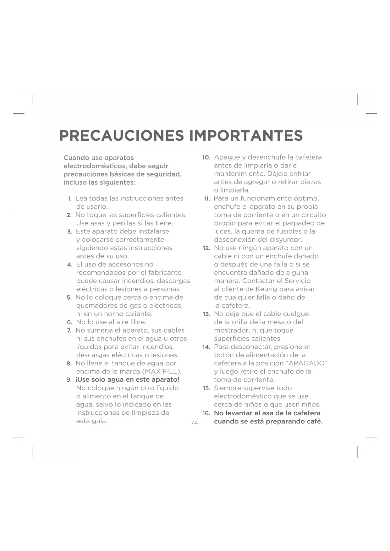 CUIDADO: Hay tres agujas filosas que perforan las dosis, dos arriba y otra abajo del soporte de dosis. Para evitar riesgo de lesiones, no ponga los dedos en el interior de la caja de ensamble de la dosis. CUIDADO: El agua dentro del soporte de dosis está muy caliente durante la preparación. Para evitar cualquier tipo de lesión, no levante el asa ni abra la caja del ensamble durante la infusión. CUIDADO: No lo llene por encima de la marca (MAX FILL). Si llena el tanque de agua por encima de esta línea, es posible que su primera infusión sea más grande que la seleccionada. Si prefiere tener un tanque lleno hasta la orilla, le aconsejamos que use un tazón más grande para su primera infusión; ello evitará posibles derrames. CUIDADO: Por favor, coloque siempre su cafetera en posición vertical, de este modo evitará posibles lesiones y/o que se rompa su cafetera. CUIDADO: Líquido muy caliente. Se requiere la supervisión de un adulto.