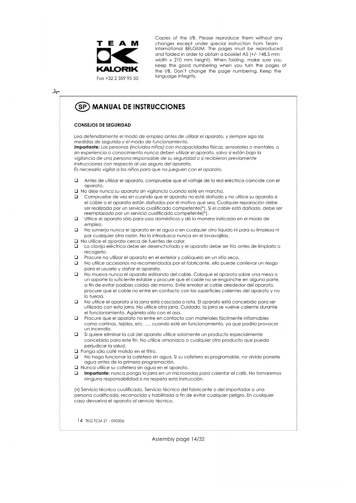 Fax +32 2 359 95 50 Una vez vacío el tanque, apague la cafetera y vacíe la jarra. Enjuague la cafetera dos o tres veces repitiendo el proceso descrito antes y utilizando sólo agua fría. CONSEJO Cuando empiece a notar que el café tarda en pasar más tiempo de lo habitual, decalcifique su aparato y no espere, sobre todo, a que la situación se agrave, con ello mantendrá más tiempo la vida de su aparato. El mantenimiento de su cafetera es importante para la duración de vida de su aparato. Tenga en cuenta que la garantía no cubre los deterioros causado por el mal uso, ni el recambio de la resistencia por estar cubierta de cal. PROTECCIÓN DEL MEDIO AMBIENTE – DIRECTIVA 2002/96/CE Para poder preservar nuestro medio ambiente y proteger la salud humana, los residuos eléctricos y equipos electrónicos deberían ser destruidos de acuerdo con unas normas especificas con la implicación de ambos proveedores y consumidores. Por esta razón, como indica el símbolo en la placa de datos técnicos, su aparato no debería ser tirado en un contenedor municipal sino que debería ser devuelto a la tienda, o dejado en un punto de recolección para ser reciclado o usado para otras aplicaciones conforme a la directiva. Copies of the I/B. Please reproduce them without any changes except under special instruction from Team International BELGIUM. The pages must be reproduced and folded in order to obtain a booklet A5 (+/- 148.5 mm width x 210 mm height). When folding, make sure you keep the good numbering when you turn the pages of the I/B. Don’t change the page numbering. Keep the language integrity.