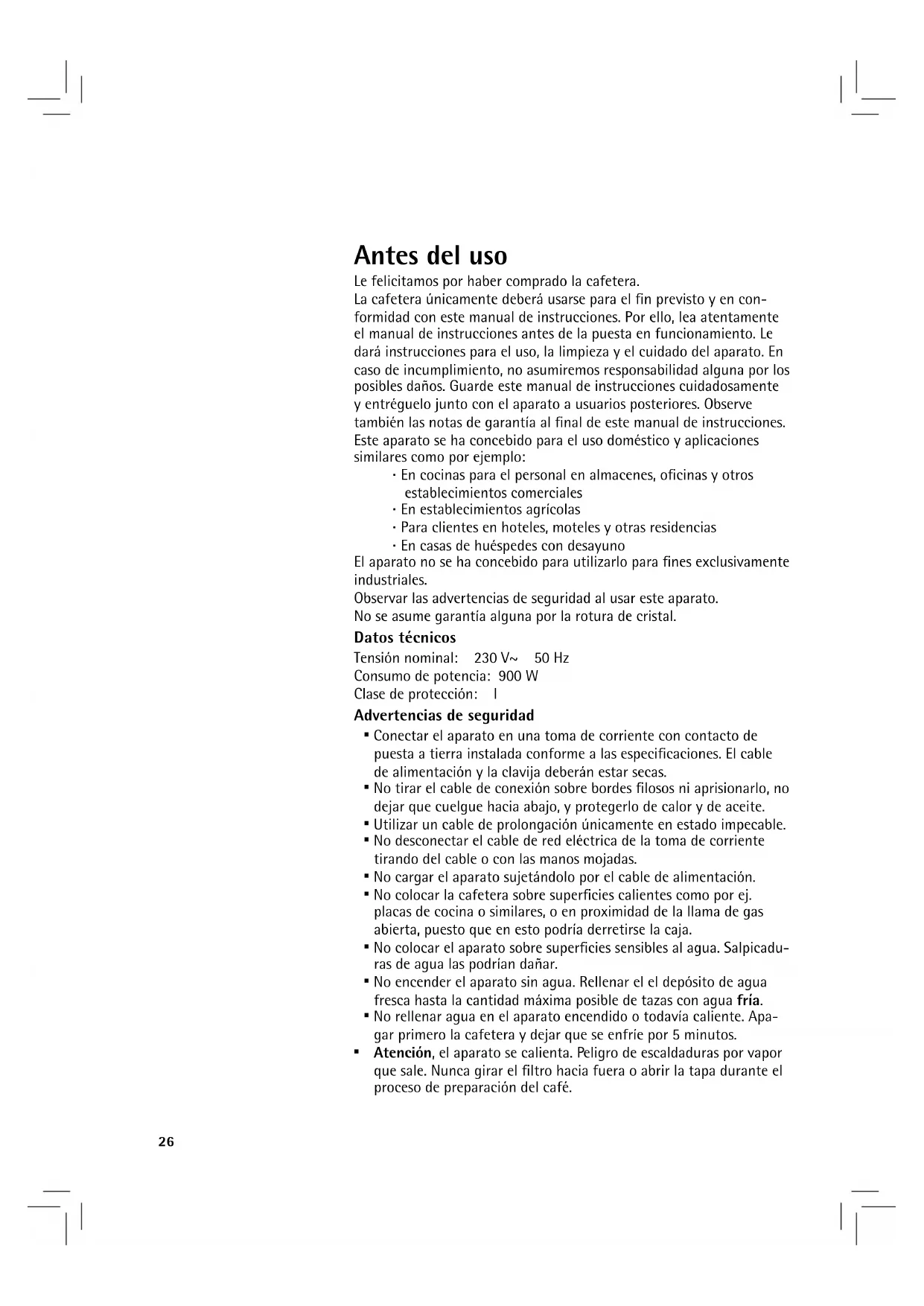 - No rellenar agua en el aparato encendido o todavía caliente. Apa- gar primero la cafetera y dejar que se enfríe por 5 minutos.