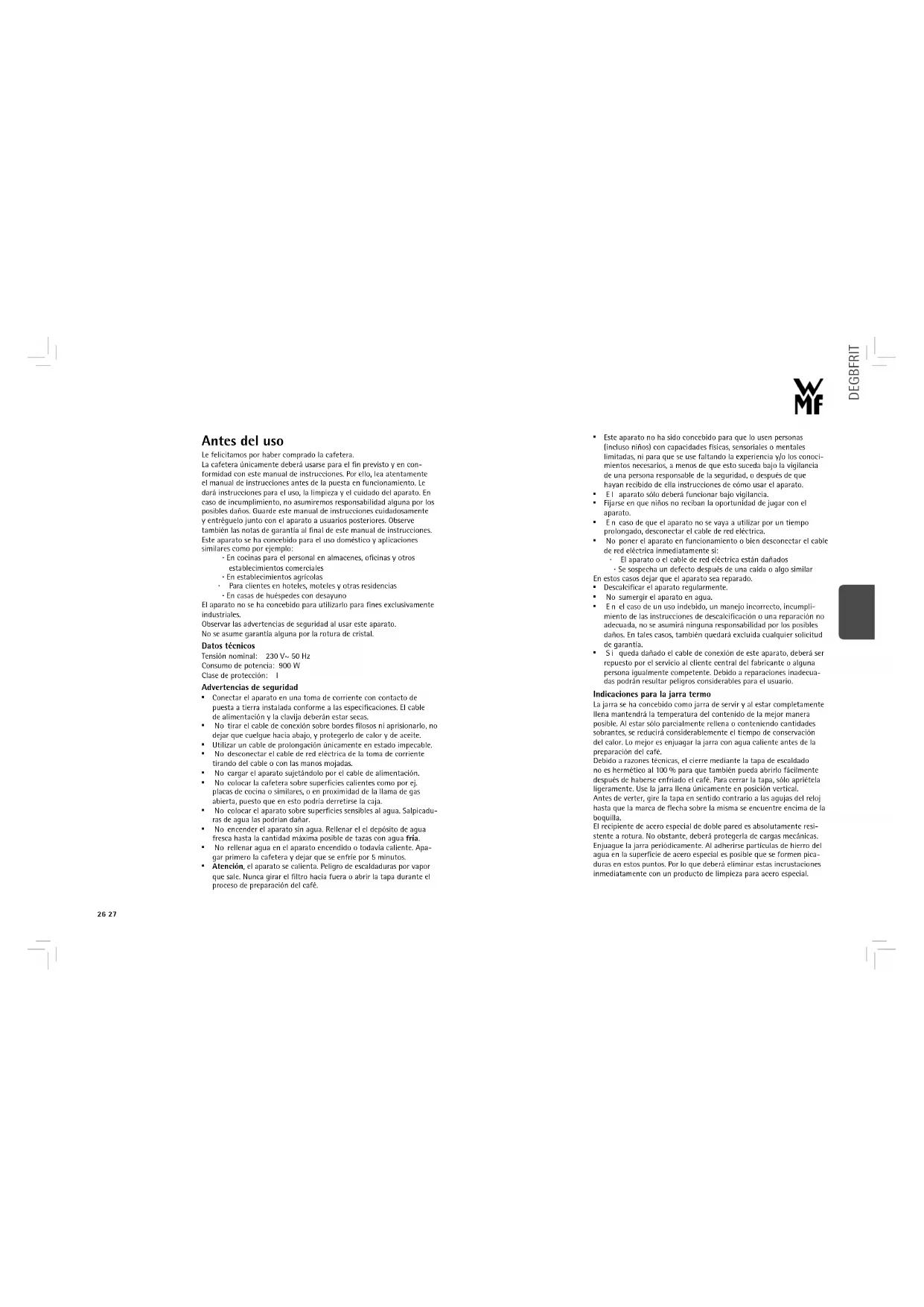 - S i queda dañado el cable de conexión de este aparato, deberá ser repuesto por el servicio al cliente central del fabricante o alguna persona igualmente competente. Debido a reparaciones inadecua- das podrán resultar peligros considerables para el usuario. Indicaciones para la jarra termo La jarra se ha concebido como jarra de servir y al estar completamente llena mantendrá la temperatura del contenido de la mejor manera posible. Al estar sólo parcialmente rellena o conteniendo cantidades sobrantes, se reducirá considerablemente el tiempo de conservación del calor. Lo mejor es enjuagar la jarra con agua caliente antes de la preparación del café. Debido a razones técnicas, el cierre mediante la tapa de escaldado no es hermético al 100 % para que también pueda abrirlo fácilmente después de haberse enfriado el café. Para cerrar la tapa, sólo apriétela ligeramente. Use la jarra llena únicamente en posición vertical. Antes de verter, gire la tapa en sentido contrario a las agujas del reloj hasta que la marca de flecha sobre la misma se encuentre encima de la boquilla. El recipiente de acero especial de doble pared es absolutamente resi- stente a rotura. No obstante, deberá protegerla de cargas mecánicas. Enjuague la jarra periódicamente. Al adherirse partículas de hierro del agua en la superficie de acero especial es posible que se formen pica- duras en estos puntos. Por lo que deberá eliminar estas incrustaciones inmediatamente con un producto de limpieza para acero especial.28 29 DEGBFRITESNLDASVFINO Puesta en funcionamiento AAntes▪del▪primer▪uso▪y▪después▪de▪que▪el▪aparato▪haya▪estado▪fuera▪ de▪funcionamiento▪por▪un▪tiempo▪prolongado,▪deberá▪realizar▪un▪ proceso▪de▪hervido▪con▪el▪relleno▪máximo▪de▪agua▪y▪sin▪café▪molido.▪A▪ continuación,▪deberá▪enjuagar▪el▪filtro▪y▪la▪jarra▪con▪agua▪caliente. Desconexión automática Después▪del▪encendido,▪una▪desconexión▪automática▪se▪encargará▪ de▪que▪el▪aparato▪no▪se▪sobrecaliente.▪El▪aparato▪apenas▪se▪apagará▪ después▪de▪que▪haya▪pasado▪toda▪el▪agua. Es▪posible▪un▪apagado▪antes▪de▪tiempo▪pulsando▪el▪interruptor.▪Esto▪ podría▪ser▪necesario▪si▪ha▪encendido▪el▪aparato▪inadvertidamente▪sin▪ agua.▪Antes▪de▪rellenar▪el▪aparato▪caliente▪será▪imprescindible▪que▪deje▪ enfriar▪el▪mismo▪por▪algunos▪minutos. Preparación de café Abra▪la▪tapa▪del▪aparato▪y▪vierta▪agua▪fría▪en▪el▪depósito.▪El▪indicador▪ de▪nivel▪de▪agua▪sirve▪para▪indicar▪la▪cantidad▪de▪agua▪fresca▪que▪se▪ requiere▪para▪preparar▪la▪cantidad▪deseada▪de▪tazas. Nota:▪Si▪involuntariamente▪ha▪rellenado▪demasiada▪agua,▪será▪posible▪ volver▪a▪vaciarla▪a▪través▪del▪orificio▪de▪derrame▪trasero.▪No▪incline▪el▪ aparato▪hacia▪delante▪para▪vaciar▪el▪depósito. Abra▪el▪filtro▪giratorio▪para▪meter▪café▪molido▪pulsando▪el▪botón▪ OPEN.▪Meta▪un▪filtro▪de▪papel▪del▪tamaño▪1▪x▪4▪en▪el▪filtro▪pero▪doble▪ primero▪los▪bordes▪estampados.▪El▪filtro▪de▪papel▪no▪deberá▪sobresalir▪ por▪encima▪del▪borde▪del▪filtro;▪por▪lo▪que▪deberá▪ser▪presionado▪ ligeramente▪con▪la▪mano. Meta▪la▪cantidad▪requerida▪de▪café▪molido.▪Según▪el▪gusto▪personal,▪ se▪calcularán▪unos▪5-7▪g▪de▪café▪molido▪medio▪por▪taza.▪Si▪ha▪sido▪ molido▪demasiado▪finamente,▪es▪posible▪que▪se▪desborde▪el▪líquido▪del▪ filtro. Coloque▪la▪jarra▪termo▪con▪la▪tapa▪de▪escaldado▪cerrada▪debajo▪del▪ filtro.▪Conecte▪el▪cable▪de▪red▪eléctrica▪en▪una▪toma▪de▪corriente▪con▪ contacto▪de▪puesta▪a▪tierra▪y▪pulsar▪el▪interruptor. #▪La▪luz▪testigo▪señaliza▪el▪inicio▪del▪proceso▪de▪escaldado.▪Después▪de▪ haber▪pasado▪toda▪el▪agua,▪el▪aparato▪se▪apagará▪automáticamente▪ y▪la▪luz▪testigo▪se▪apagará.▪Espere▪algunos▪minutos▪hasta▪que▪todo▪el▪ café▪haya▪pasado▪a▪la▪jarra.▪Después▪de▪sacar▪la▪jarra,▪el▪dispositivo▪ antigoteo▪en▪el▪filtro▪evitará▪que▪el▪café▪continúe▪goteando. Antes▪de▪que▪pueda▪preparar▪café▪de▪nuevo,▪el▪aparato▪deberá▪enfri- arse▪por▪algunos▪minutos. Limpieza Desconecte▪el▪cable▪de▪red▪eléctrica▪y▪deje▪que▪el▪aparato▪se▪enfríe. No▪sumerja▪el▪aparato▪en▪agua,▪sino▪frote▪su▪exterior▪con▪un▪trapo▪ húmedo▪al▪que▪ha▪agregado▪una▪pequeña▪cantidad▪de▪detergente▪ lavavajillas. Limpie▪el▪filtro▪bajo▪agua▪corriente▪o▪en▪el▪lavavajillas.▪Enjuague▪el▪ interior▪de▪la▪jarra▪únicamente▪con▪agua▪caliente▪después▪de▪cada▪uso.▪ De▪ninguna▪manera▪deberá▪meter▪la▪misma▪al▪lavavajillas.▪Si▪después▪ de▪un▪tiempo▪prolongado▪se▪han▪formado▪incrustaciones▪en▪la▪jarra,▪ podrá▪eliminar▪las▪mismas▪cuidadosamente▪usando▪una▪tableta▪de▪ limpieza▪de▪dentadura▪postiza:▪rellene▪agua,▪agregue▪la▪tableta▪y▪deje▪ que▪haga▪efecto▪durante▪varias▪horas.▪A▪continuación,▪enjuague▪la▪ jarra▪varias▪veces. No▪utilice▪productos▪de▪limpieza▪cáusticos▪o▪abrasivos. Descalcificación Las▪incrustaciones▪de▪cal▪causan▪pérdidas▪de▪energía▪y▪reducen▪la▪vida▪ útil▪del▪aparato.▪El▪mismo▪se▪apagará▪antes▪de▪tiempo▪si▪la▪capa▪de▪ cal▪es▪demasiado▪gruesa.▪Entonces,▪ya▪será▪muy▪difícil▪eliminarla.▪Por▪ ello,▪descalcif