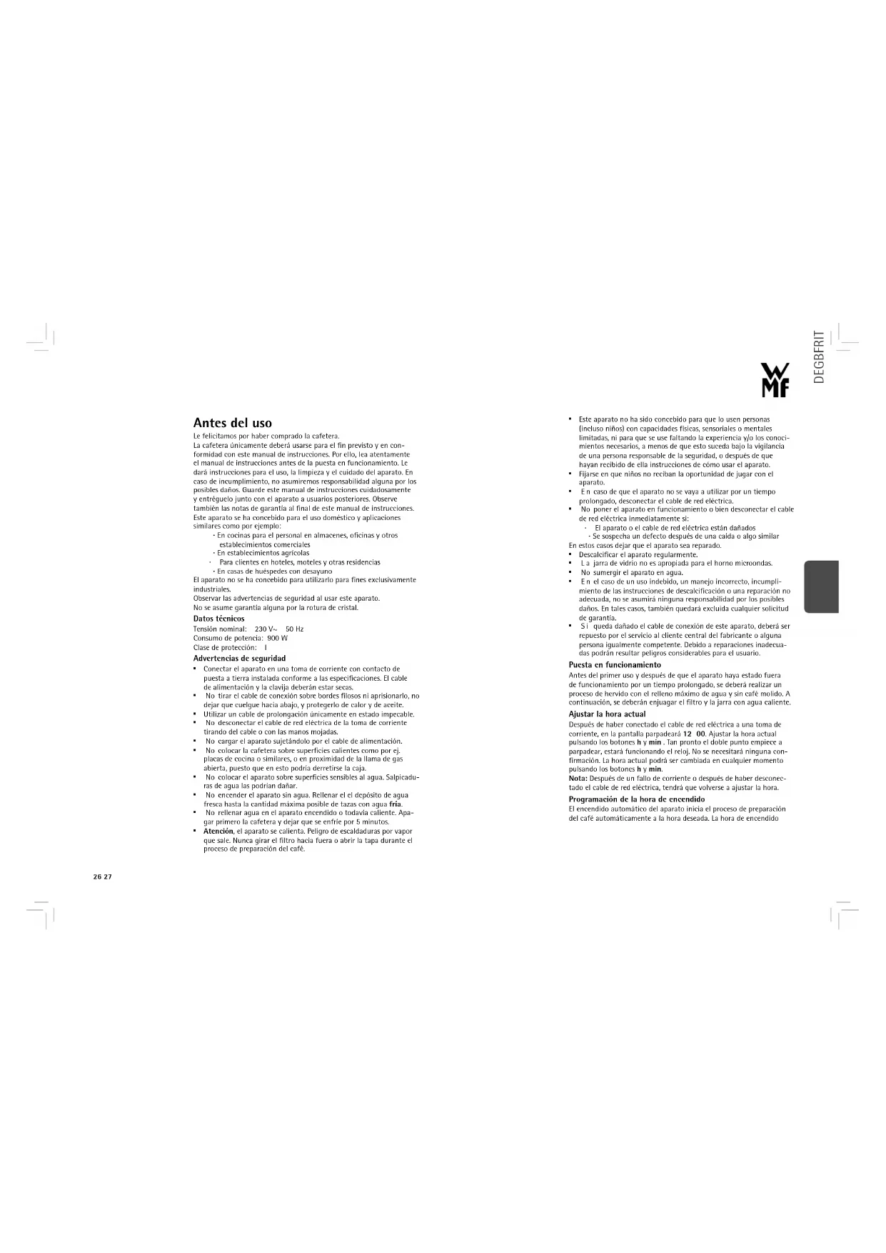 - S i queda dañado el cable de conexión de este aparato, deberá ser repuesto por el servicio al cliente central del fabricante o alguna persona igualmente competente. Debido a reparaciones inadecua- das podrán resultar peligros considerables para el usuario. Puesta en funcionamiento Antes del primer uso y después de que el aparato haya estado fuera de funcionamiento por un tiempo prolongado, se deberá realizar un proceso de hervido con el relleno máximo de agua y sin café molido. A continuación, se deberán enjuagar el filtro y la jarra con agua caliente. Ajustar la hora actual Después de haber conectado el cable de red eléctrica a una toma de corriente, en la pantalla parpadeará 12 00. Ajustar la hora actual pulsando los botones h y min . Tan pronto el doble punto empiece a parpadear, estará funcionando el reloj. No se necesitará ninguna con- firmación. La hora actual podrá ser cambiada en cualquier momento pulsando los botones h y min. Nota: Después de un fallo de corriente o después de haber desconec- tado el cable de red eléctrica, tendrá que volverse a ajustar la hora. Programación de la hora de encendido El encendido automático del aparato inicia el proceso de preparación del café automáticamente a la hora deseada. La hora de encendido28 29 DEGBFRITESNLDASVFINO podrá▪ajustarse▪con▪hasta▪24▪horas▪de▪anticipación.▪Será▪visualizada▪ si▪se▪pulsa▪el▪botón▪set.▪En▪la▪pantalla▪aparecerá▪BREW.▪Manteni- endo▪pulsado▪el▪botón▪set,▪ajustar▪la▪hora▪de▪encendido▪pulsando▪los▪ botones▪h▪y▪min. Nota:▪Después▪de▪un▪fallo▪de▪corriente▪o▪después▪de▪haber▪desconec- tado▪el▪cable▪de▪red▪eléctrica,▪tendrá▪que▪volverse▪a▪ajustar▪la▪hora▪de▪ encendido. Preparación de café Abrir▪la▪tapa▪trasera▪del▪aparato▪y▪rellenar▪el▪depósito▪con▪agua▪fría.▪El▪ indicador▪de▪nivel▪de▪agua▪sirve▪para▪indicar▪la▪cantidad▪de▪agua▪fresca▪ que▪se▪requerirá▪para▪preparar▪la▪cantidad▪deseada▪de▪tazas▪de▪125▪ml.▪ La▪escala▪en▪el▪asa▪de▪la▪jarra▪de▪vidrio▪indica▪la▪cantidad▪de▪tazas▪de▪ 125▪ml▪de▪café▪preparado.▪ Nota:▪Si▪involuntariamente▪se▪ha▪rellenado▪demasiada▪agua,▪será▪ posible▪volver▪a▪vaciarla▪a▪través▪del▪orificio▪de▪derrame▪trasero.▪No▪ incline▪el▪aparato▪hacia▪delante▪para▪vaciar▪el▪depósito. Para▪meter▪café▪molido,▪abrir▪la▪tapa▪delantera.▪Meta▪un▪filtro▪de▪papel▪ del▪tamaño▪1▪x▪4▪en▪el▪filtro▪pero▪doblar▪primero▪los▪bordes▪estampa- dos.▪El▪filtro▪de▪papel▪no▪deberá▪sobresalir▪por▪encima▪del▪borde▪del▪ filtro;▪por▪lo▪que▪deberá▪ser▪presionado▪ligeramente▪con▪la▪mano. Meter▪la▪cantidad▪requerida▪de▪café▪molido.▪Según▪el▪gusto▪personal,▪ se▪calcularán▪unos▪5-7▪g▪de▪café▪molido▪medio▪por▪taza.▪Si▪se▪ha▪ moilido▪demasiado▪finamente,▪es▪posible▪que▪se▪derrame▪el▪líquido▪del▪ filtro. Encendido automático Si▪la▪preparación▪debe▪comenzar▪a▪la▪hora▪de▪encendido▪programada,▪ pulsar▪una▪vez▪el▪botón▪Start/Stop.▪En▪la▪pantalla▪aparecerá▪AUTO,▪ y▪la▪luz▪testigo▪