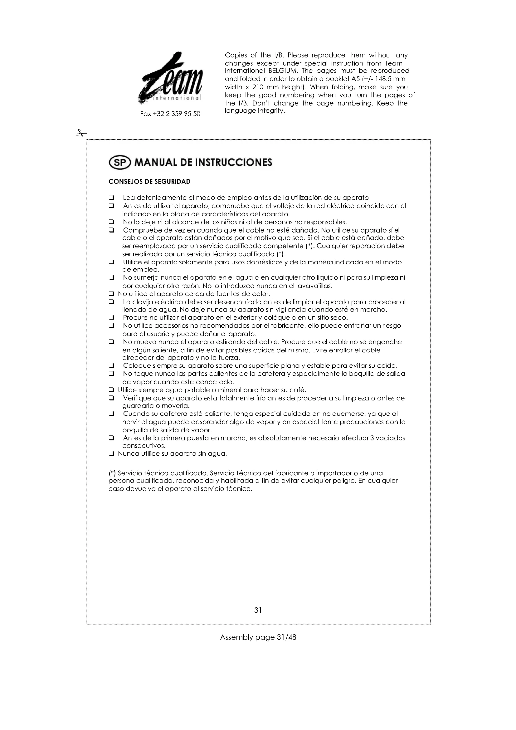 Fax +32 2 359 95 50 Sobresalga el agua del soporte del filtro -el soporte del filtro no está bien colocado. -El soporte del filtro no está bien cerrado. -La junta está sucia y tiene que ser limpiada. -La junta ya no es elastica y debe ser reemplazada. -Residuos de café permanecen en los alrededores del soporte del filtro. -El filtro está bloqueado por residuos de café y tieme que ser limpiado/reemplazado. -si estas soluciones no son suficientes, consulte con un sercicio tecnico cualidicado. Que el café no salga -Que no haya agua en el deposito. -Que no haya café en el filtro o en el soporte del filtro. -Que el café molido sea demasiado fino y pueda llegar a taponar la salida.. -Los agujeros del filtro o del disco estén bloqueados. Limpielos (vea instrucciones de limpieza). Copies of the I/B. Please reproduce them without any changes except under special instruction from Team International BELGIUM. The pages must be reproduced and folded in order to obtain a booklet A5 (+/- 148.5 mm width x 210 mm height). When folding, make sure you keep the good numbering when you turn the pages of the I/B. Don‟t change the page numbering. Keep the language integrity.