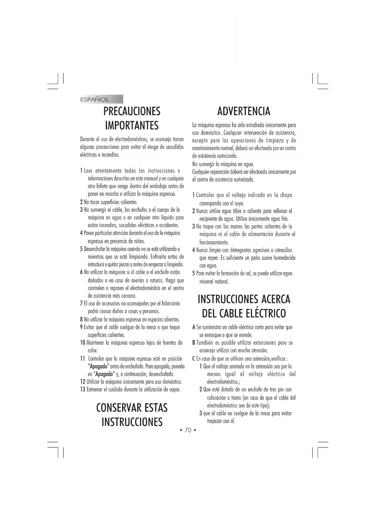 - 70 • PRECAUCIONES IMPORTANTES Durante el uso de electrodomésticos, se aconseja tomar algunas precauciones para evitar el riesgo de sacudidas eléctricas o incendios. 1 Leer atentamente todas las instrucciones e informaciones descritas en este manual y en cualquier otro folleto que venga dentro del embalaje antes de poner en marcha o utilizar la máquina espresso. 2 No tocar superficies calientes. 3 No sumergir el cable, los enchufes o el cuerpo de la máquina en agua o en cualquier otro líquido para evitar incendios, sacudidas eléctricas o accidentes. 4 Poner particular atención durante el uso de la máquina espresso en presencia de niños. 5 Desenchufar la máquina cuando no se esté utilizando o mientras que se está limpiando. Enfriarla antes de introducir o quitar piezas y antes de empezar a limpiarla. 6 No utilizar la máquina si el cable o el enchufe están dañados o en caso de averías o roturas. Haga que controlen o reparen el electrodoméstico en el centro de asistencia más cercano. 7 El uso de accesorios no aconsejados por el fabricante podrá causar daños a cosas y personas. 8 No utilizar la máquina espresso en espacios abiertos. 9 Evitar que el cable cuelgue de la mesa o que toque superficies calientes. 10 Mantener la máquina espresso lejos de fuentes de calor. 11 Controlar que la máquina espresso esté en posición “Apagado” antes de enchufarla. Para apagarla, ponerla en “Apagado” y, a continuación, desenchufarla. 12 Utilizar la máquina únicamente para uso doméstico. 13 Extremar el cuidado durante la utilización de vapor. CONSERVAR ESTAS INSTRUCCIONES ADVERTENCIA La máquina espresso ha sido estudiada únicamente para uso doméstico. Cualquier intervención de asistencia, excepto para las operaciones de limpieza y de mantenimiento normal, deberá ser efectuada por un centro de asistencia autorizado. No sumergir la máquina en agua. Cualquier reparación deberá ser efectuada únicamente por el centro de asistencia autorizado. 1 Controlar que el voltaje indicado en la chapa corresponda con el suyo. 2 Nunca utilice agua tibia o caliente para rellenar el recipiente de agua. Utilice únicamente agua fría. 3 No toque con las manos las partes calientes de la máquina ni el cable de alimentación durante el funcionamiento. 4 Nunca limpie con detergentes agresivos o utensilios que rayen. Es suficiente un paño suave humedecido con agua. 5 Para evitar la formación de cal, se puede utilizar agua mineral natural. INSTRUCCIONES ACERCA