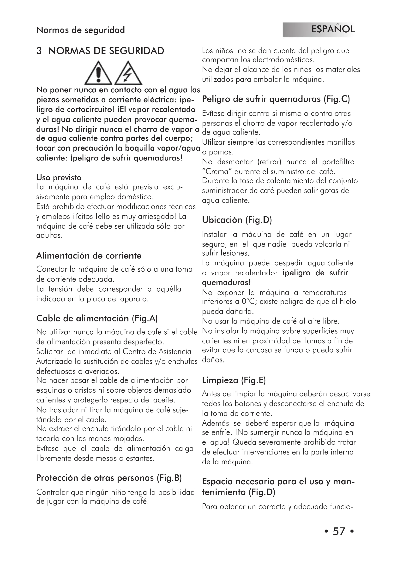 No poner nunca en contacto con el agua las piezas sometidas a corriente eléctrica: ¡pe- ligro de cortocircuito! ¡El vapor recalentado y el agua caliente pueden provocar quema- duras! No dirigir nunca el chorro de vapor o de agua caliente contra partes del cuerpo; tocar con precaución la boquilla vapor/agua caliente: ¡peligro de sufrir quemaduras! Uso previsto La máquina de café está prevista exclu- sivamente para empleo doméstico. Está prohibido efectuar modificaciones técnicas y empleos ilícitos ¡ello es muy arriesgado! La máquina de café debe ser utilizada sólo por adultos. Alimentación de corriente Conectar la máquina de café sólo a una toma de corriente adecuada. La tensión debe corresponder a aquélla indicada en la placa del aparato. Cable de alimentación (Fig.A) No utilizar nunca la máquina de café si el cable de alimentación presenta desperfecto. Solicitar de inmediato al Centro de Asistencia Autorizado la sustitución de cables y/o enchufes defectuosos o averiados. No hacer pasar el cable de alimentación por esquinas o aristas ni sobre objetos demasiado calientes y protegerlo respecto del aceite. No trasladar ni tirar la máquina de café suje- tándola por el cable. No extraer el enchufe tirándolo por el cable ni tocarlo con las manos mojadas. Evítese que el cable de alimentación caiga libremente desde mesas o estantes. Protección de otras personas (Fig.B) Controlar que ningún niño tenga la posibilidad de jugar con la máquina de café. Los niños no se dan cuenta del peligro que comportan los electrodomésticos. No dejar al alcance de los niños los materiales utilizados para embalar la máquina. Peligro de sufrir quemaduras (Fig.C) Evítese dirigir contra sí mismo o contra otras personas el chorro de vapor recalentado y/o de agua caliente. Utilizar siempre las correspondientes manillas o pomos. No desmontar (retirar) nunca el portafiltro “Crema” durante el suministro del café. Durante la fase de calentamiento del conjunto suministrador de café pueden salir gotas de agua caliente. Ubicación (Fig.D) Instalar la máquina de café en un lugar seguro, en el que nadie pueda volcarla ni sufrir lesiones. La máquina puede despedir agua caliente o vapor recalentado: ¡peligro de sufrir quemaduras! No exponer la máquina a temperaturas inferiores a 0°C; existe peligro de que el hielo pueda dañarla. No usar la máquina de café al aire libre. No instalar la máquina sobre superficies muy calientes ni en proximidad de llamas a fin de evitar que la carcasa se funda o pueda sufrir daños. Limpieza (Fig.E) Antes de limpiar la máquina deberán desactivarse todos los botones y desconectarse el enchufe de la toma de corriente. Además se deberá esperar que la máquina se enfríe. ¡No sumergir nunca la máquina en el agua! Queda severamente prohibido tratar de efectuar intervenciones en la parte interna de la máquina. Espacio necesario para el uso y man- tenimiento (Fig.D) Para obtener un correcto y adecuado funcio- Normas de seguridad 4316036000 - SIN024X Rev00.indd 57 10/05/2004 11.57.41ESPAÑOL