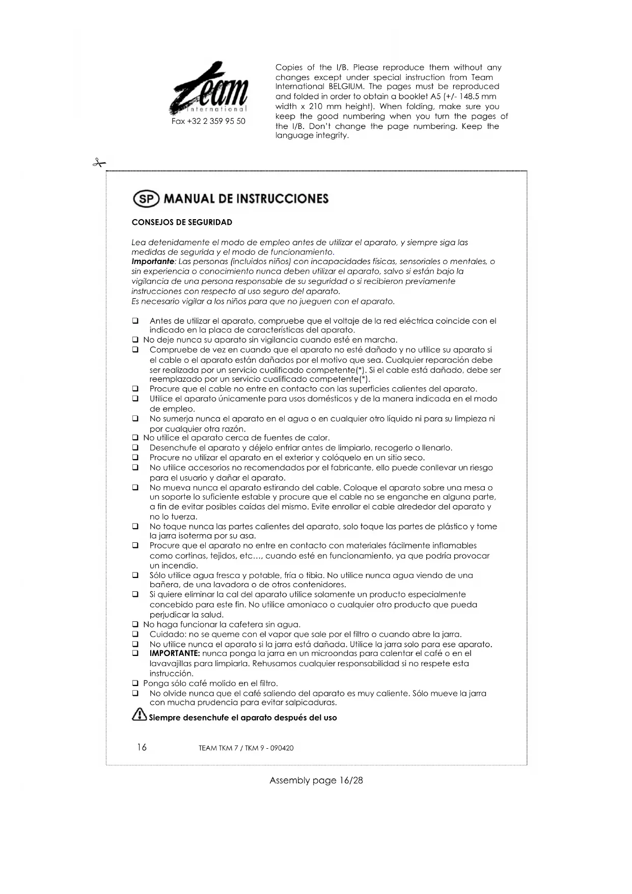 Fax +32 2 359 95 50 Le aconsejamos desincrustar su aparato con regularidad para conservar la cafetera en buen estado. Para ello, utilice un desincrustante para cafeteras eléctricas que venden en el mercado y siga sus instrucciones. Después enjuague el aparato con agua fresca, sin café molido. La garantía no cubre los aparatos que no hayan sido desincrustadas. No ponga nunca su aparato y sus accesorios en un lavavajillas. Sólo limpie la jarra con agua jabonosa. Utilice un paño ligeramente húmedo y no abrasivo para las partes de plástico. PROTECCIÓN DEL MEDIO AMBIENTE –DIRECTIVA 2002/96/CE Para poder preservar nuestro medio ambiente y proteger la salud humana, los residuos eléctricos y equipos electrónicos deberían ser destruidos de acuerdo con unas normas especificas con la implicación de ambos proveedores y consumidores. Por esta razón, como indica el símbolo en la placa de datos técnicos, su aparato no debería ser tirado en un contenedor municipal sino que debería ser devuelto a la tienda, o dejado en un punto de recolección para ser reciclado o usado para otras aplicaciones conforme a la directiva. Copies of the I/B. Please reproduce them without any changes except under special instruction from Team International BELGIUM. The pages must be reproduced and folded in order to obtain a booklet A5 (+/- 148.5 mm width x 210 mm height). When folding, make sure you keep the good numbering when you turn the pages of the I/B. Don’t change the page numbering. Keep the language integrity.