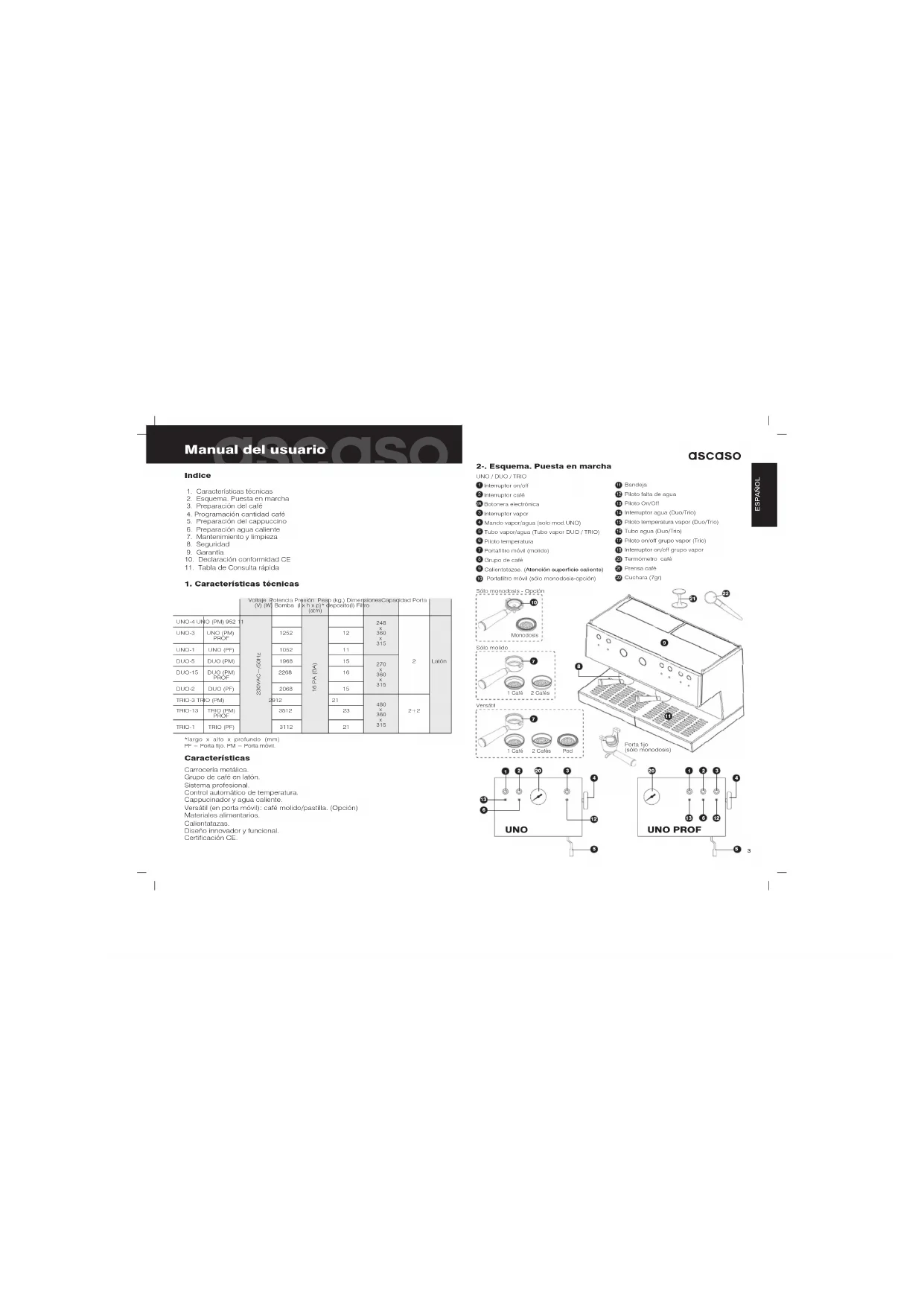 ascaso Manual del usuario Voltaje Potencia Presión Peso (kg.) DimensionesCapacidad Porta(V) (W) Bomba (l x h x p)* deposito(l) Filtro(atm)UNO-4 UNO (PM) 952 11UNO-3 UNO (PM) 1252 12 PROF