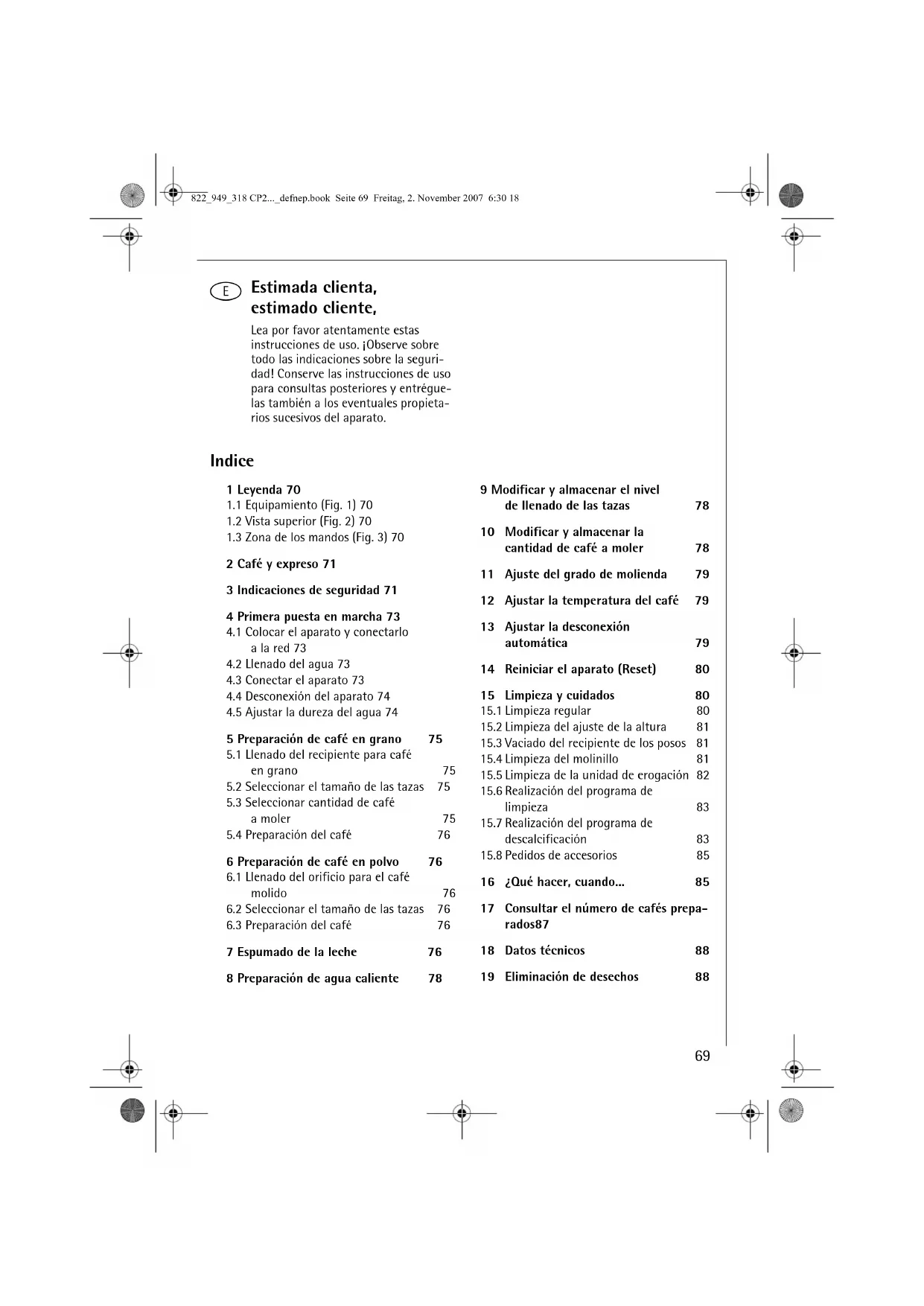 16 ¿Qué hacer, cuando... 85 17 Consultar el número de cafés prepa- rados87 18 Datos técnicos 88 19 Eliminación de desechos 88 822_949_318 CP2..._defnep.book Seite 69 Freitag, 2. November 2007 6:30 18e