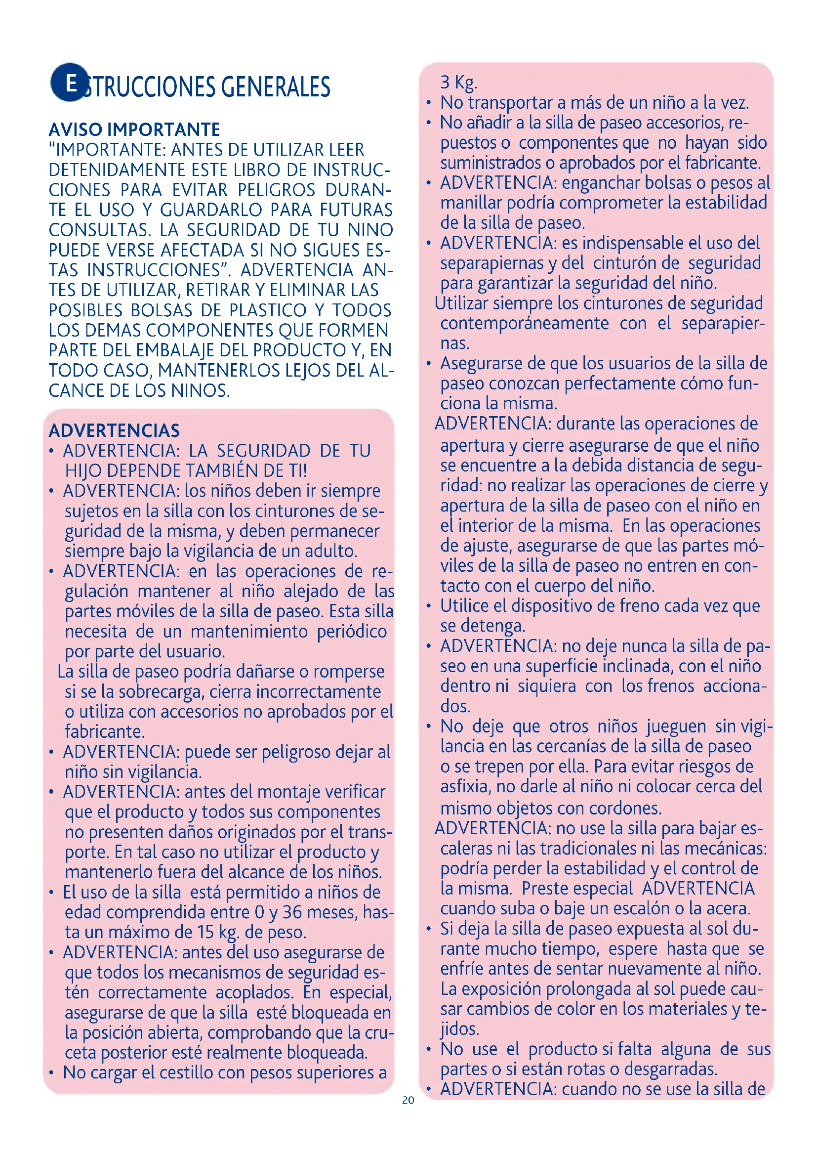 - ADVERTENCIA: en las operaciones de re- gulación mantener al niño alejado de las partes móviles de la silla de paseo. Esta silla necesita de un mantenimiento periódico por parte del usuario. La silla de paseo podría dañarse o romperse si se la sobrecarga, cierra incorrectamente o utiliza con accesorios no aprobados por el fabricante.