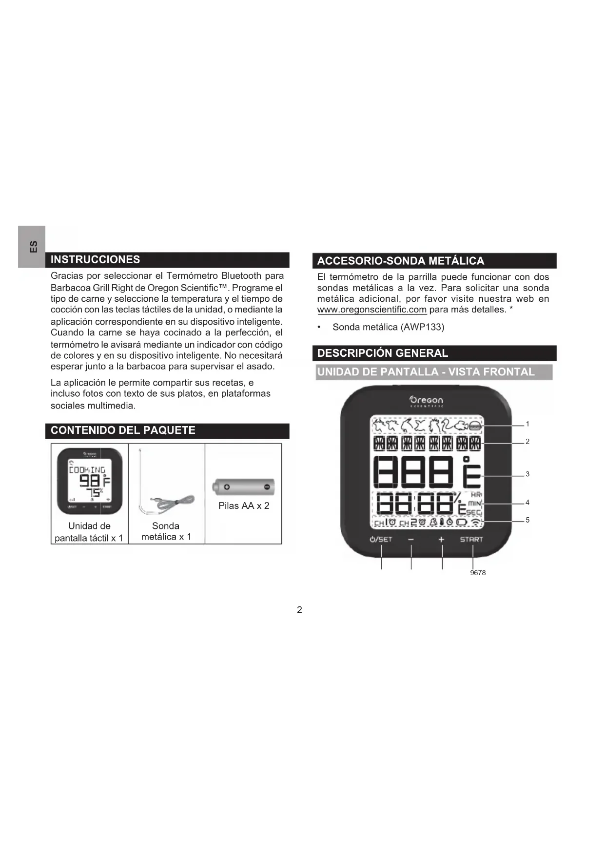 El termómetro de la parrilla puede funcionar con dos sondas metálicas a la vez. Para solicitar una sonda metálica adicional, por favor visite nuestra web en www.oregonscientific.com para más detalles. *