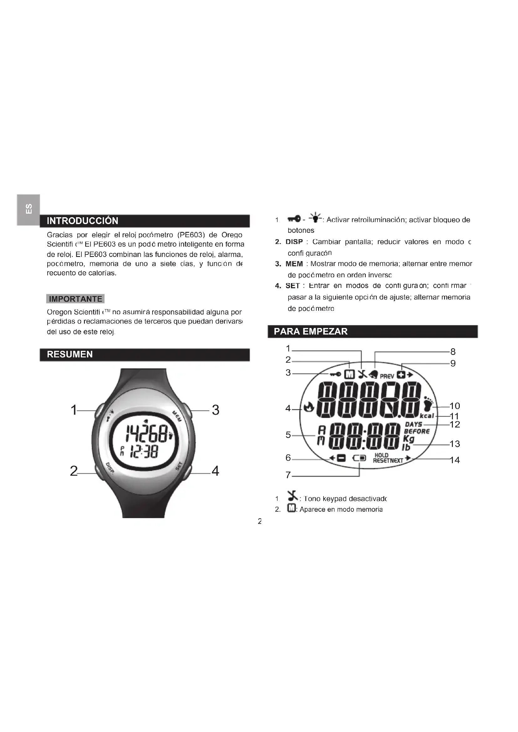 eloj podómetro (Model: PE603) cumple con los requisitos esenciales de la directiva EMC 89/336/CE. Tiene a su disposición una copia fi rmada y sellada de la Declaración de Conformidad, solicítela al Departamento de Atención al Cliente de Oregon Scientifi c. PE603_ES_M_REV1.indd 7 8/7/07 5:56:40 PM1