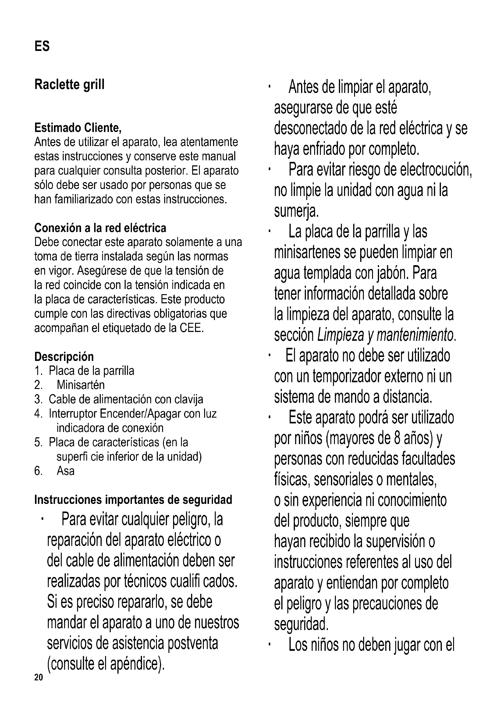 por los clientes de hoteles, pensiones, etc. y establecimientos similares, - en casas rurales.22 Antes del primer uso ∙ Retire por completo todo el material de embalaje. ∙ Antes de encender el aparato por primera vez, limpie la placa de la parrilla y las minisartenes con un paño húmedo. ∙ Es aconsejable calentar el aparato y las sartenes durante 15 minutos, sin colocar ningún alimento, para eliminar el olor típico que se genera al encender el grill por primera vez (también podría observarse una pequeña cantidad de humo). Se debe ventilar la habitación sufi cientemente, abriendo ventanas o balcones. ∙ Espere hasta que el grill se haya enfriado de nuevo. ∙ Límpielo siguiendo las indicaciones de la sección Limpieza y mantenimiento. Placa de la parrilla Antes de encender el aparato, coloque la placa de la parrilla sobre el aparato encima del componente térmico y acóplela correctamente. Para acoplar la placa, deberá empujarla hacia abajo y moverla hacia el símbolo de modo que los topes salientes queden correctamente acoplados. Para desencajar la placa, empújela hacia el símbolo . Funcionamiento ∙ Coloque la placa de la parrilla sobre el aparato, del modo descrito previamente. Enchufe el cable eléctrico en una toma de corriente y encienda el aparato. ∙ Después de precalentar el aparato durante 10 minutos aproximadamente, estará listo para usar. Coloque los alimentos que desea cocinar sobre la placa de la parrilla. Se recomienda aplicar primero una ligera capa de aceite en la placa para evitar que los alimentos se adhieran. ∙ Coloque el queso de raclette en las minisartenes. Coloque las minisartenes en el aparato, bajo el elemento térmico, y espere hasta que el queso se derrita. Advertencia: No coloque las minisartenes vacías en el aparato cuando esté encendido, sino que deberá dejarlas sobre una superfi cie termorresistente. ∙ Después de utilizar el aparato, apáguelo y desenchúfelo de la toma de corriente. Modo de preparación del queso en raclette Utilice unos 200-300 gr. de queso por persona. Prepare el queso en lonchas de unos 3-5 mm de grosor y colóquelas en las minisartenes. Es preferible utilizar un queso apropiado para fundir. Consejos prácticos ∙ Los alimentos congelados deben descongelarse previamente para su cocción posterior. ∙ Para no dañar el recubrimiento de las minisartenes y la placa de la parrilla, utilice solo una espátula de madera o de plástico termorresistente durante el asado de alimentos. Limpieza y mantenimiento ∙ Antes de limpiar el aparato, asegúrese siempre de que está desenchufado y se ha enfriado por completo. ∙ Por razones de seguridad, no sumerja nunca el aparato en agua u otros líquidos. ∙ No use detergentes abrasivos. ∙ Limpie la carcasa con un paño húmedo. ∙ Extraiga la placa de la parrilla y límpiela en agua templada con detergente;23 después séquela por completo con un paño suave. Eliminación Los dispositivos en los que fi gura este símbolo deben ser eliminados por separado de la basura doméstica, porque contienen componentes valiosos que pueden ser reciclados. La eliminación correcta ayuda a proteger el medio ambiente y la salud de las personas. Consulte a las autoridades municipales o el establecimiento de venta donde podrán facilitarle la información relevante. Los aparatos eléctricos que ya no son utilizables se pueden entregar gratuitamente en el establecimiento de venta. Garantía Este producto está garantizado por un período de dos años, contado a partir de la fecha de compra, contra cualquier defecto en materiales o mano de obra. Esta garantía sólo es válida si el aparato ha sido utilizado siguiendo las instrucciones de uso, sempre que no haya sido modifi cado, reparado o manipulado por cualquier persona no autorizada o haya sido estropeado como consecuencia de un uso inadecuado del mismo. Naturalmente esta garantía no cubre las averías debidas a uso o desgaste normales, así como aquellas piezas de fácil rotura tales como cristales, piezas cerámicas, etc. Esta garantía no afecta a los derechos legales del consumidor ante la falta de conformidad del producto con el contrato de compraventa.24 Griglia Raclette Gentile Cliente, Prima di utilizzare l’apparecchio, vi raccomandiamo di leggere attentamente le seguenti istruzioni e di conservarle per farvi riferimento anche in futuro. L’apparecchio deve essere utilizzato solo da persone che hanno preso familiarità con le seguenti istruzioni. Collegamento alla rete L’apparecchio deve esser collegato esclusivamente a una presa di corrente con messa a terra, installata a norma di legge. Assicuratevi che la tensione d’alimentazione corrisponda alla tensione indicata sulla targhetta portadati. Questo prodotto è conforme alle direttive vincolanti per l’etichettatura CE. Descrizione dell’apparecchio