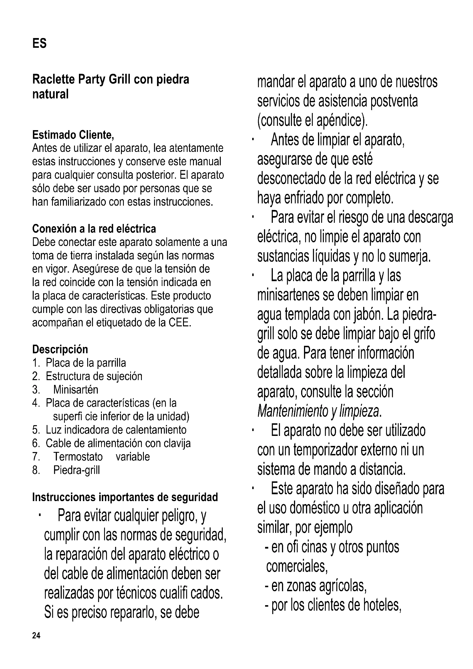 Instrucciones importantes de seguridad ∙ Para evitar cualquier peligro, y cumplir con las normas de seguridad, la reparación del aparato eléctrico o del cable de alimentación deben ser realizadas por técnicos cualifi cados. Si es preciso repararlo, se debe mandar el aparato a uno de nuestros servicios de asistencia postventa (consulte el apéndice). ∙ Antes de limpiar el aparato, asegurarse de que esté desconectado de la red eléctrica y se haya enfriado por completo. ∙ Para evitar el riesgo de una descarga eléctrica, no limpie el aparato con sustancias líquidas y no lo sumerja. ∙ La placa de la parrilla y las minisartenes se deben limpiar en agua templada con jabón. La piedra- grill solo se debe limpiar bajo el grifo de agua. Para tener información detallada sobre la limpieza del aparato, consulte la sección Mantenimiento y limpieza. ∙ El aparato no debe ser utilizado con un temporizador externo ni un sistema de mando a distancia. ∙ Este aparato ha sido diseñado para el uso doméstico u otra aplicación similar, por ejemplo - en ofi cinas y otros puntos comerciales, - en zonas agrícolas, - por los clientes de hoteles, ES25 pensiones, etc. y establecimientos similares, - en casas rurales. ∙ Este aparato podrá ser utilizado por niños (mayores de 8 años) y personas con reducidas facultades físicas, sensoriales o mentales, o sin experiencia ni conocimiento del producto, siempre que hayan recibido la supervisión o instrucciones referentes al uso del aparato y entiendan por completo el peligro y las precauciones de seguridad. ∙ Los niños no deben jugar con el aparato. ∙ No se debe permitir que los niños realicen ningún trabajo de limpieza o mantenimiento del aparato a menos que estén bajo vigilancia y tengan más de 8 años. ∙ El aparato y su cable eléctrico siempre se deben mantener fuera del alcance de niños menores de 8 años. ∙ Precaución: Mantenga a los niños alejados del material de embalaje, porque podría ser peligroso, existe el peligro de asfi xia. ∙ Antes de utilizar el aparato, es importante examinar detenidamente la carcasa, el cable eléctrico y cualquier accesorio instalado para detectar cualquier posible fallo o defecto. En caso de que el aparato haya caído sobre una superfi cie dura, o se haya tirado en exceso del cable de alimentación, no se deberá utilizar de nuevo: En caso de que el aparato caiga sobre una superfi cie dura, por ejemplo, no se debe utilizar de nuevo: incluso los desperfectos no visibles pueden tener efectos adversos sobre la seguridad en el uso del aparato. ∙ El cable se debe mantener sufi cientemente alejado de las partes calientes del aparato. ∙ Precaución: Peligro de quemaduras. La superfi cie del aparato, las zonas de la parrilla y las minisartenes se calientan durante el uso. ∙ No deje el aparato sin vigilar durante su funcionamiento. ∙ Durante el funcionamiento, se debe colocar el aparato sobre una superfi cie termorresistente, a prueba de salpicaduras y manchas. Cuando se cocinan alimentos con un contenido alto de grasa o humedad, no siempre se pueden evitar las salpicaduras. ∙ No coloque el grill junto a una pared ni esquina, y compruebe que no se guarda ningún material infl amable junto al grill. ∙ Antes de su utilización, la piedra-grill y la placa de la parrilla se deben colocar encima del aparato, sobre el componente térmico. ∙ Atención: No ponga el aparato en funcionamiento en el exterior. ∙ Desenchufe siempre el aparato - después del uso, - si hay una avería, y26 - antes de limpiarlo. ∙ Para desenchufar, no tire nunca del cable; coja la clavija. ∙ Este aparato sólo debe usarse con los accesorios suministrados por la fábrica. ∙ Antes de retirar la piedra-grill y la placa de la parrilla y antes de limpiar o guardar el aparato, siempre deberá esperar el tiempo necesario para que el aparato se enfríe. ∙ No se acepta responsabilidad en caso de averías debido al uso incorrecto del aparato o si estas instrucciones no han sido observadas debidamente. Modo de uso Antes del primer uso Retire por completo todo el material de embalaje. Antes de utilizar el grill por primera vez, limpie la piedra-grill, la placa de la parrilla y las minisartenes con un paño húmedo. Es aconsejable calentar el aparato y las sartenes durante 10 minutos aproximadamente, sin colocar ningún alimento, para eliminar el olor típico que se emitirá al encender el grill por primera vez. También se apreciará una pequeña cantidad de humo durante su utilización, por ello debe ventilarse la habitación durante su uso. Piedra ∙ Coloque la piedra sobre el componente térmico del aparato, con la cara suave hacia arriba. La parte central más gruesa de la piedra se debe apoyar sobre los dos rieles de la estructura de modo que esté correctamente sujeta. ∙ Cuidado: evite colocar la piedra fría sobre un elemento caliente. ∙ La piedra se puede utilizar para cocinar verduras, fi letes de carne o pescado, etc. según sea necesario. ∙ Esta piedra está hecha de material natural. Las pequeñas grietas producidas por la expansión y contracción durante el calentamiento y enfriamiento, así como un oscurecimiento, son normales y no tienen ningún efecto adverso. ∙ No coloque ningún alimento congelado ni alimentos que contengan vinagre (como pepinillos en vinagre o mostaza) sobre la piedra. Placa de la parrilla Antes de encender el aparato, coloque la placa encima del aparato sobre el componente térmico con la cara nervada hacia arriba, comprobando que los huecos de la base encajan sobre los rieles de la estructura de modo que la placa no se mueva. ∙ La placa de la parrilla se puede utilizar para preparar verdura, carne o pescado. Termostato variable ∙ El termostato variable controla el tiempo de funcionamiento del elemento térmico, y la luz indicadora señalará su estado operativo actual. Elemento térmico encendido = luz indicadora encendida Elemento térmico apagado = luz indicadora a