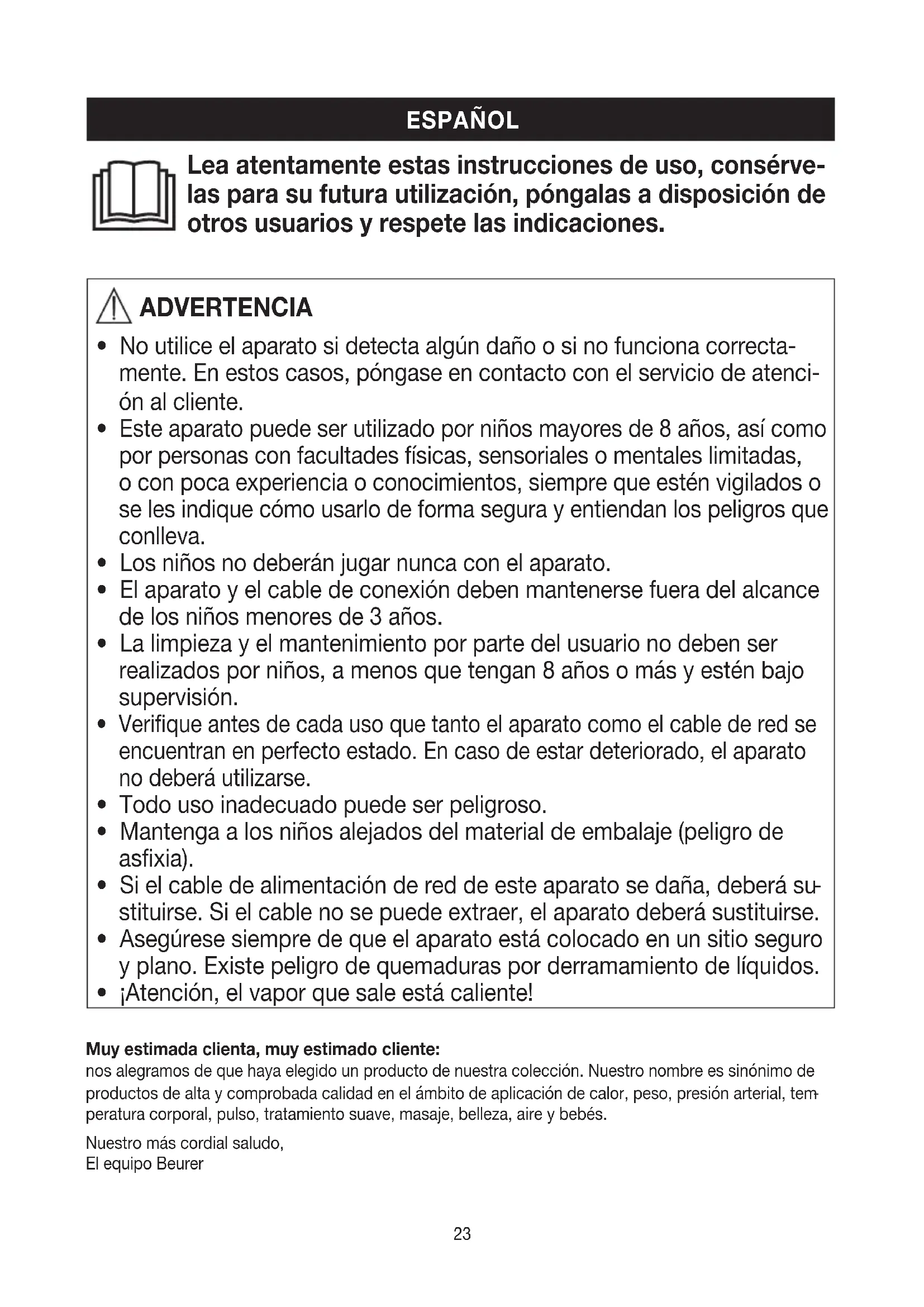 peratura corporal, pulso, tratamiento suave, masaje, belleza, aire y bebés. Nuestro más cordial saludo, El equipo Beurer ESPAÑOL24