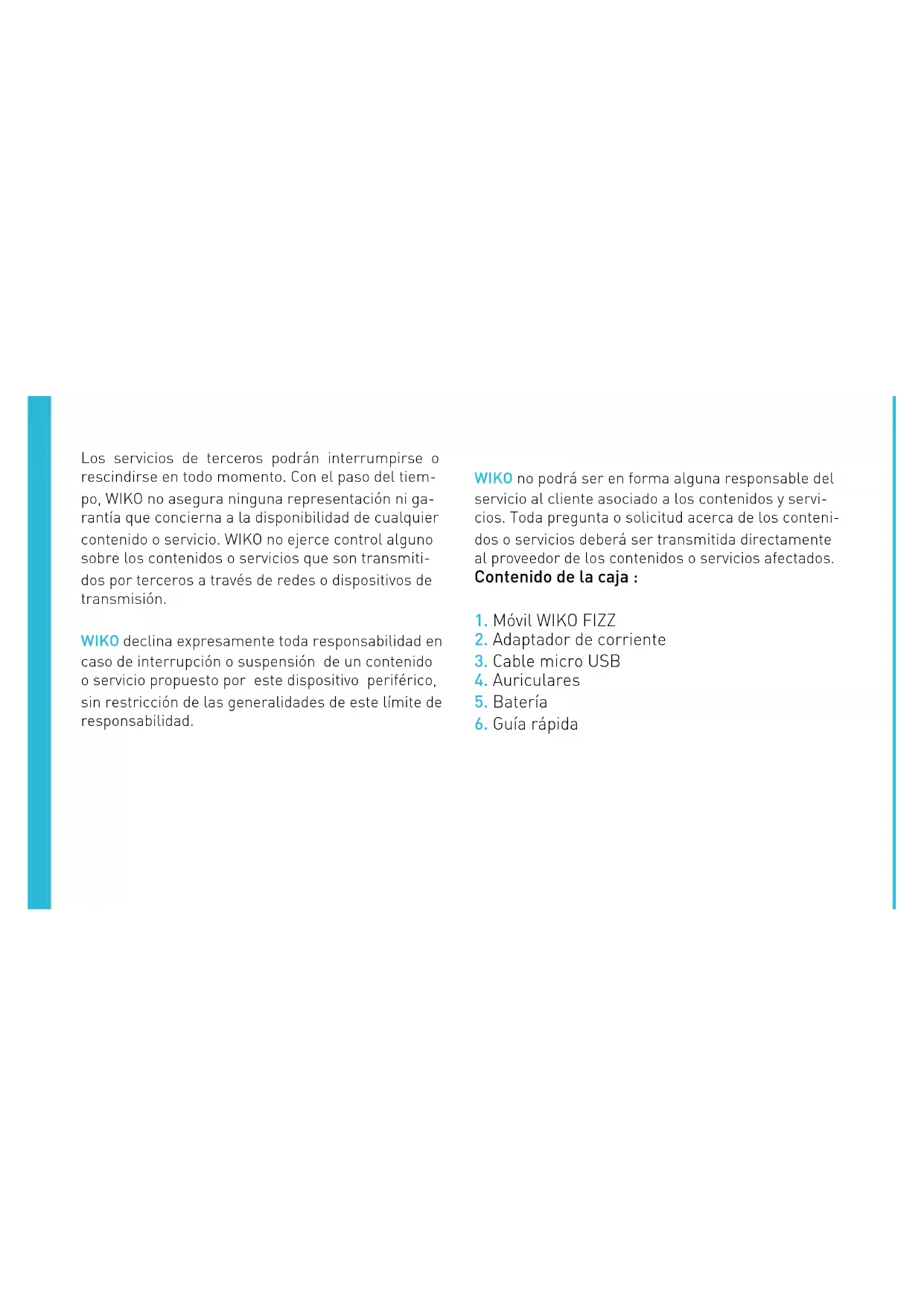 no en función de la versión del software o de tu operador telefónico¡ ENHORABUENA ! Acabas de adquirir tu teléfono móvil WIKO FIZZ. En esta guía encontrarás toda la información relativa a la utilización de este teléfono móvil para que, se- gún deseamos, te familiarices rápidamente con el universo WIKO. Copyright © 2014 WIKO es.wikomobile.com La información que contiene esta guía no podrá en ningún caso transmitirse, reproducirse o difundirse de forma alguna sin la autorización por escrito de WIKO. Marcas comerciales WIKO es una marca registrada de WIKO. Nota WIKO se reserva el derecho de modificar en cualquier momento la información de esta guía, la cual se ha elaborado con el mayor cuidado, si bien toda la in- formación y recomendaciones que aquí constan no constituyen garantía alguna. Límite de la responsabilidad La integridad de los servicios y contenidos accesibles a través de este aparato son propiedad exclusiva de terceros, por lo que está protegida por la legislación (derecho de autor, patente, licencia u otras leyes en materia de propiedad intelectual). Estos servicios se reservan al uso personal por parte del comprador y no para una utilización comercial. No se autoriza la utilización de dichos contenidos o servicios sin la autorización previa por escrito del propietario del con- tenido. El comprador de ninguna forma podrá copiar, publicar, transferir, vender ni explotar en uno u otro soporte los contenidos o servicios editados por medio de este aparato, así como producir derivados de éstos. LOS SERVICIOS Y CONTENIDOS DE TERCEROS SEsUMINIsTRAN “TAL CUAL”. WIkO NO GARANTIZA LOs CONTENIDOs NI sERVICIOs AsÍ PREsTADOs, DE FORMA EXPREsA NI IMPLÍCITA, CUALQUIERA QUE sEA EL FIN DEsEADO, AsÍ COMO LAs GARANTÍAs DE COMERCIABILIDAD Y ADECUACIÓN A UN UsO PARTICULAR. WIkO NO GARANTIZA LA GARANTÍA DE EXACTITUD, VALIDEZ, LEGALIDAD O EXHAUsTIVIDAD DE LOs CONTENIDOs O sERVICIOs PREsTADOs POR EsTE APARATO. WIkO DECLINA TODA REsPONsABI- LIDAD EN CAsO DE NEGLIGENCIA, TANTO A NIVEL DE REsPONsABILIDAD CONTRACTUAL O DELICTIVA, DE DAÑOs DIRECTOs O INDIRECTOs, FORTUITOs O EsPECIALEs, DE HONORARIOs DE ABOGADOs, DE GAsTOs O DE CUALQUIER OTRO PERJUICIO REsUL- TANTE DE LA UTILIZACIÓN DE LOs CONTENIDOs O sERVICIOs POR PARTE DEL COMPRADOR O POR TERCEROs INCLUsO sI sE HA INFORMADO A WIkO DE LA POsIBILIDAD DE DICHAs CONTRARIEDADEs. DETERMINADOs PAÍsEs NO AUTORIZAN LA EXCLU- sIÓN DE GARANTÍAs IMPLÍCITAs O LA LIMITACIÓN DE LOs DERECHOs LEGALEs DEL CONsUMIDOR, EXCLUsIONEs Y LIMITACIONEs QUE PUEDEN NO APLICARsE AL COMPRADOR.Los servicios de terceros podrán interrumpirse o rescindirse en todo momento. Con el paso del tiem- po, WIKO no asegura ninguna representación ni ga- rantía que concierna a la disponibilidad de cualquier contenido o servicio. WIKO no ejerce control alguno sobre los contenidos o servicios que son transmiti- dos por terceros a través de redes o dispositivos de transmisión. WIKO declina expresamente toda responsabilidad en caso de interrupción o suspensión de un contenido o servicio propuesto por este dispositivo periférico, sin restricción de las generalidades de este límite de responsabilidad. WIKO no podrá ser en forma alguna responsable del servicio al cliente asociado a los contenidos y servi- cios. Toda pregunta o solicitud acerca de los conteni- dos o servicios deberá ser transmitida directamente al proveedor de los contenidos o servicios afectados. Contenido de la caja :