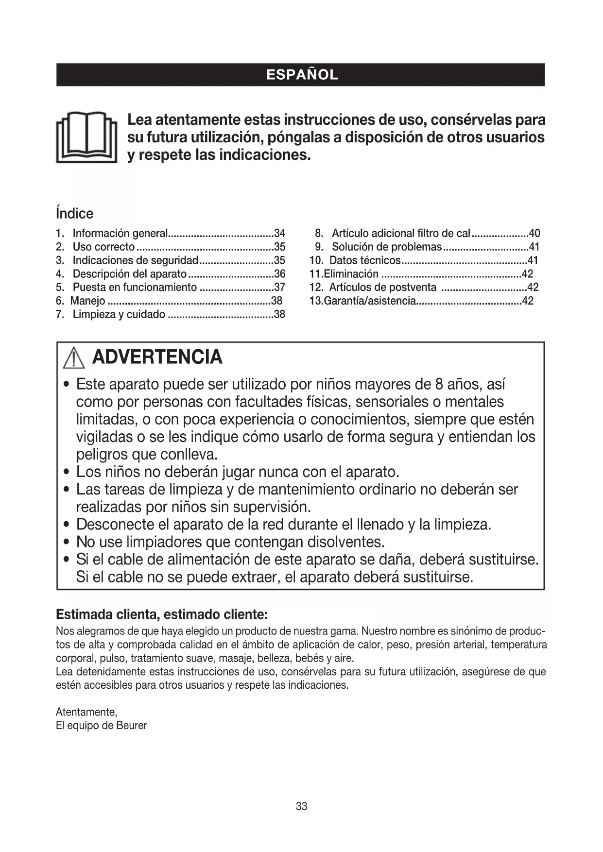 i el cable de alimentación de este aparato se daña, deberá sustituirse. Si el cable no se puede extraer, el aparato deberá sustituirse. Estimada clienta, estimado cliente: Nos alegramos de que haya elegido un producto de nuestra gama. Nuestro nombre es sinónimo de produc- tos de alta y comprobada calidad en el ámbito de aplicación de calor, peso, presión arterial, temperatura corporal, pulso, tratamiento suave, masaje, belleza, bebés y aire. Lea detenidamente estas instrucciones de uso, consérvelas para su futura utilización, asegúrese de que estén accesibles para otros usuarios y respete las indicaciones. Atentamente, El equipo de Beurer