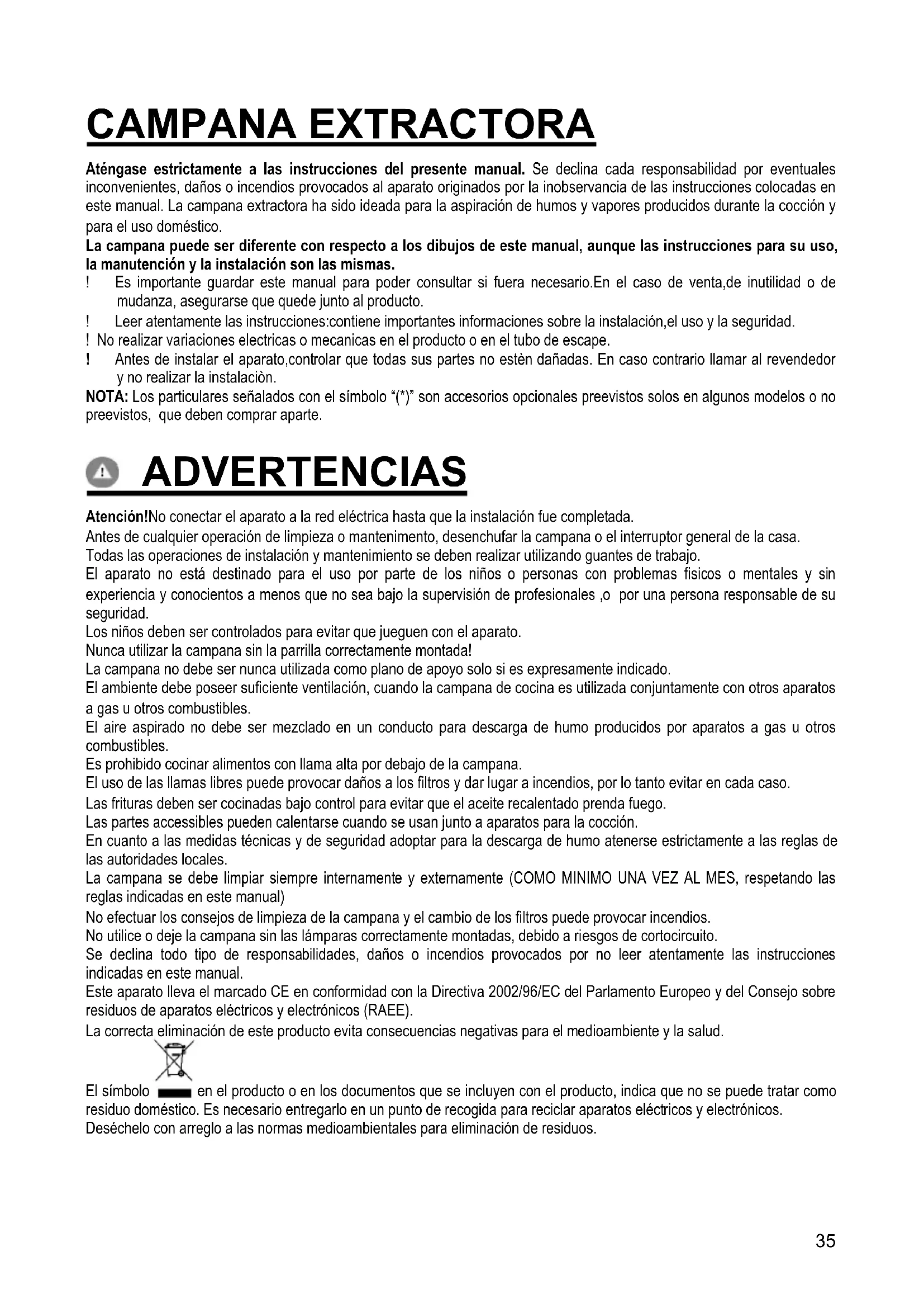 - EMC: EN 55014-1; CISPR 14-1; EN 55014-2; CISPR 14-2; EN/IEC 61000-3-2; EN/IEC 61000-3-3. Sugerencias para un uso correcto con el fin de reducir el impacto ambiental: Encienda la campana a la velocidad mínima cuando empiece a cocinar y mantenga en marcha durante unos minutos después de haber acabado de cocinar. Aumente la velocidad solo si se produjera una gran cantidad de humo y vapor y use la velocidad o velocidades turbo solo en situaciones extremas. Cambie el filtro o filtros de carbón cuando sea necesario para mantener un buen rendimiento en la reducción de los olores. Limpie el filtro o filtros de grasa cuando sea necesario para mantener un buen rendimiento del filtro de grasa. Utilice el diámetro máximo del sistema de conductos indicado en este manual, para optimizar el rendimiento y minimizar el ruido. ADVERTENCIA! La falta de instalación de tornillos y elementos de fijación de acuerdo con estas instrucciones podría comportar riesgos de naturaleza eléctrica. UTILIZACIÓN La campana està diseñada para ser utilizada tanto en la forma de extracciòn como para la forma filtrante de interior. Versión aspirante El vapor viene evacuado hacia el externo a traves de un tubo de escape introducido en el laro de sujeccion que se encuntra arriba de la campana. El diametro del tubo de escape debe ser igual al diametro del aro de sujección. En la parte horizontal, el tubo debe tener una ligera inclinación hacia el alto Conectar la campana en los tubos y en los orificios de escape de pared con diámetro equivalente a la salida del aire (brida de empalme). El uso de tubos u orificios de escape de pared con diámetro inferior, determinará una reducción de los rendimientos de la aspiración y un drástico aumento del ruido. Se declina cada responsabilidad. ! Utilice un conducto cuya longitud sea la mínima indispensable. ! Utilice un conducto con el menor número posible de curvas (ángulo máximo de la curva: 90°). ! Evite los cambios drásticos en la sección del conducto ! Utilice un conducto cuyo interior sea lo más liso posible. ! El material del conducto debe estar aprobado de conformidad con las normativas. Versión filtrante Se debe utilizar un filtro de carbón activo, disponible del vuestro proveedor.El aire aspirado viene reciclado antes de expulsarlo en el ambiente a través de la parrilla superior.37 INSTALACIÓN La distancia mínima entre la superficie de cocción y la parte más baja de la campana no debe ser inferior a 45cm en el caso de cocinas electricas y de 50cm en el caso de cocinas a gas o mixtas. Si las instrucciones para la instalación del dispositivo para cocinar con gas especifican una distancia mayor, hay que tenerlo en consideración. Conexión eléctrica La tensión de red debe corresponder con tensión indicada en la etiqueta colocada en el interior de la campana.Si es suministrada con un enchufe, conectar la campana a un enchufe conforme a las normas en vigor y colocarlo en una zona accesible, aun después de la instalación. Si no es suministrada con enchufe (conexión directa a la red) o clavija y no es posible situarla en un lugar accesible, aun después de la instalación, colocar un interruptor bipolar de acuerdo con las normativas, para asegurarse la desconexión completa a la red en el caso de la categoria de alta tensión III, conforme con las reglas de instalación. Atención! Antes de reconectar el circuito de la campana a la red y de verificar el correcto funcionamiento, controlar siempre que el cable de red fue montado correctamente. La campana está provista de un cable de alimentación especial; si el cable se daña, solicite uno nuevo al Servicio de Asistencia Técnica. Montaje Producto con peso excesivo; la campana extractora ha de ser transportada e instalada por dos o más personas. Antes de comenzar con la instalación:
