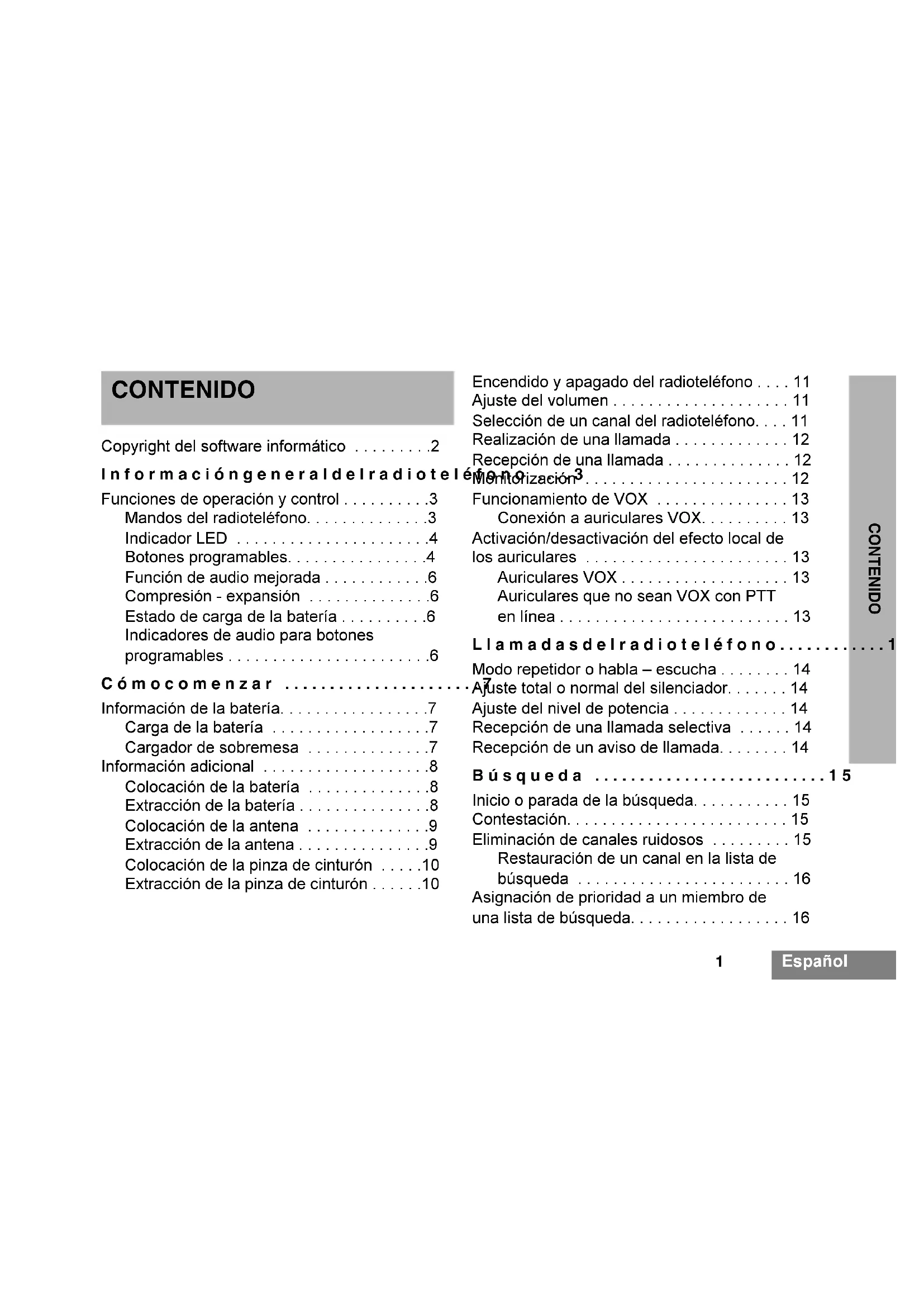 - Encendido y apagado del radioteléfono p. 11
