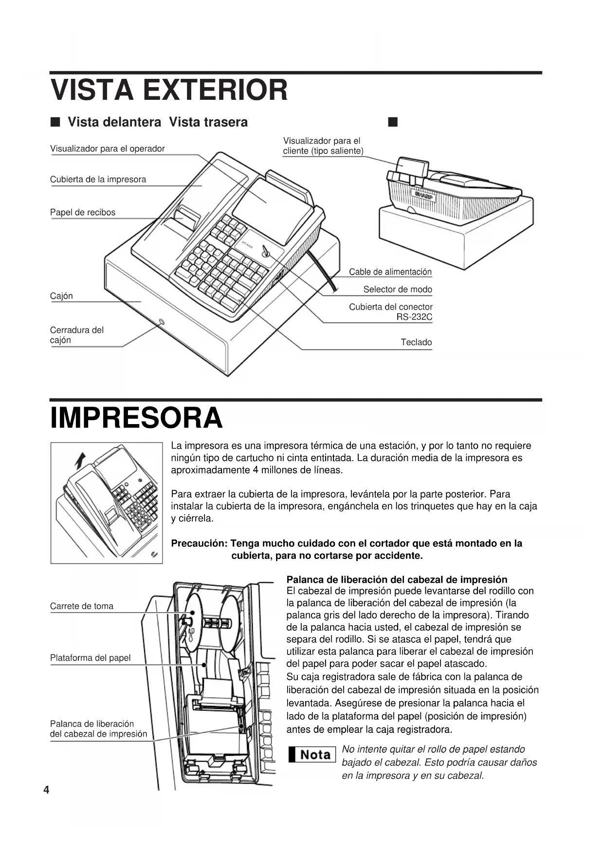 Precaución: Tenga mucho cuidado con el cortador manual que está montado en la cubierta de la impresora al sacar o volver a colocar la cubierta, para no cortarse por accidente. No toque nunca el cabezal de impresión inmediatamente después de imprimir, porque éste estará aún caliente.