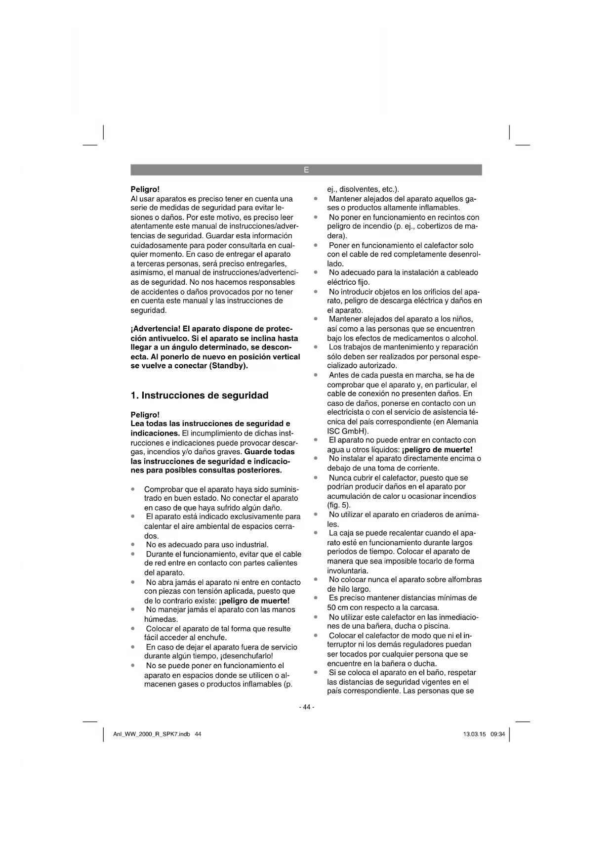 Peligro! Al usar aparatos es preciso tener en cuenta una serie de medidas de seguridad para evitar le- siones o daños. Por este motivo, es preciso leer atentamente este manual de instrucciones/adver- tencias de seguridad. Guardar esta información cuidadosamente para poder consultarla en cual- quier momento. En caso de entregar el aparato a terceras personas, será preciso entregarles, asimismo, el manual de instrucciones/advertenci- as de seguridad. No nos hacemos responsables de accidentes o daños provocados por no tener en cuenta este manual y las instrucciones de seguridad. ¡Advertencia! El aparato dispone de protec- ción antivuelco. Si el aparato se inclina hasta llegar a un ángulo determinado, se descon- ecta. Al ponerlo de nuevo en posición vertical se vuelve a conectar (Standby).