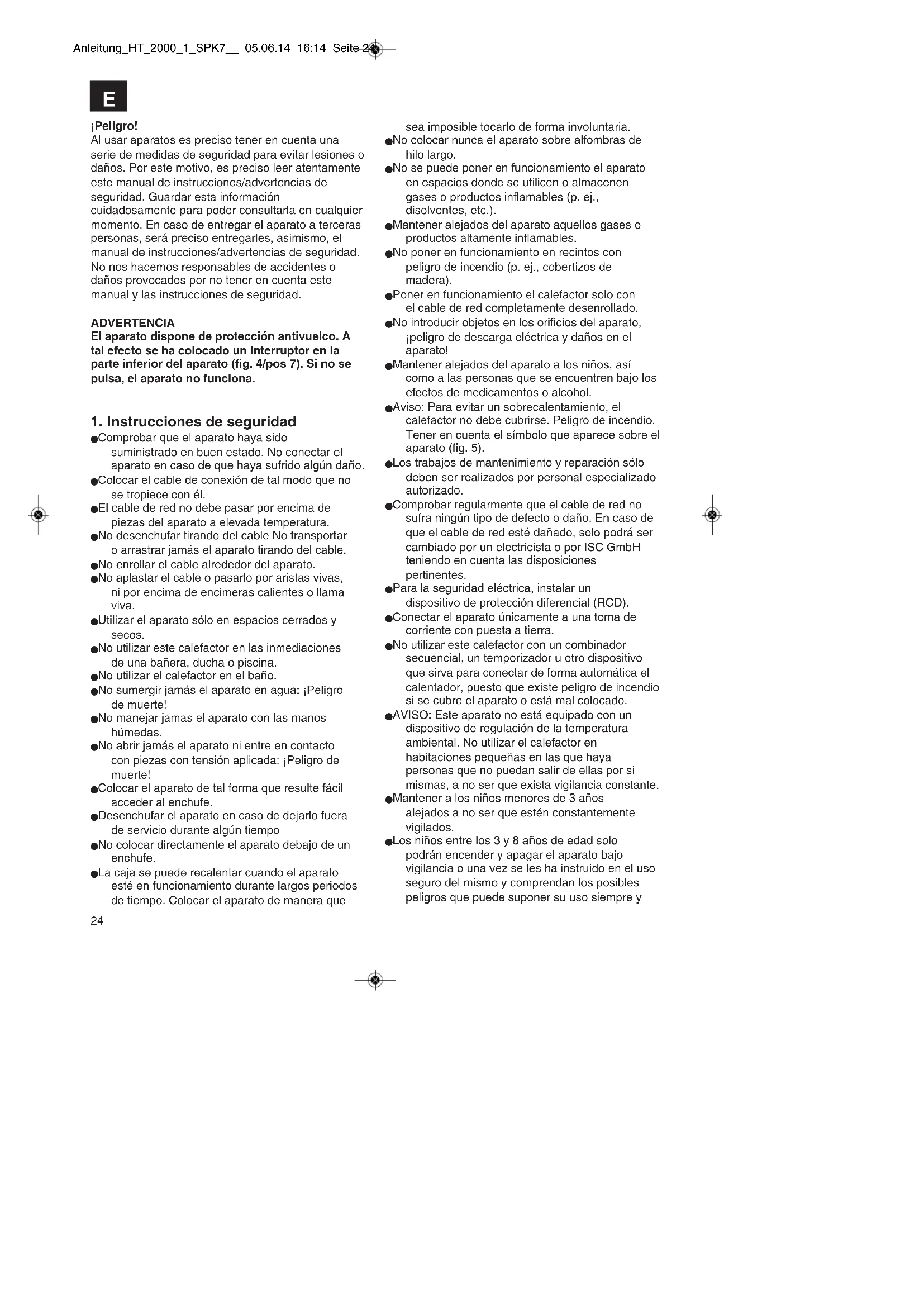 Anleitung_HT_2000_1_SPK7__ 05.06.14 16:14 Seite 24cuando el aparato se encuentre situado o instalado en una posición de uso normal. Los niños entre los 3 y 8 años de edad no podrán enchufar el aparato a la toma de corriente, regular el aparato, limpiar el aparato ni realizar el mantenimiento que corre a cargo del usuario. n ¡Cuidado! Algunas piezas del producto pueden estar muy calientes y provocar quemaduras. Se ruega prestar especial atención en presencia de niños o personas que necesiten protección. ¡Peligro! Leer todas las instrucciones de seguridad e indicaciones. El incumplimiento de dichas instrucciones e indicaciones puede provocar descargas, incendios y daños graves. Guardar todas las instrucciones de seguridad e indicaciones para posibles consultas posteriores.