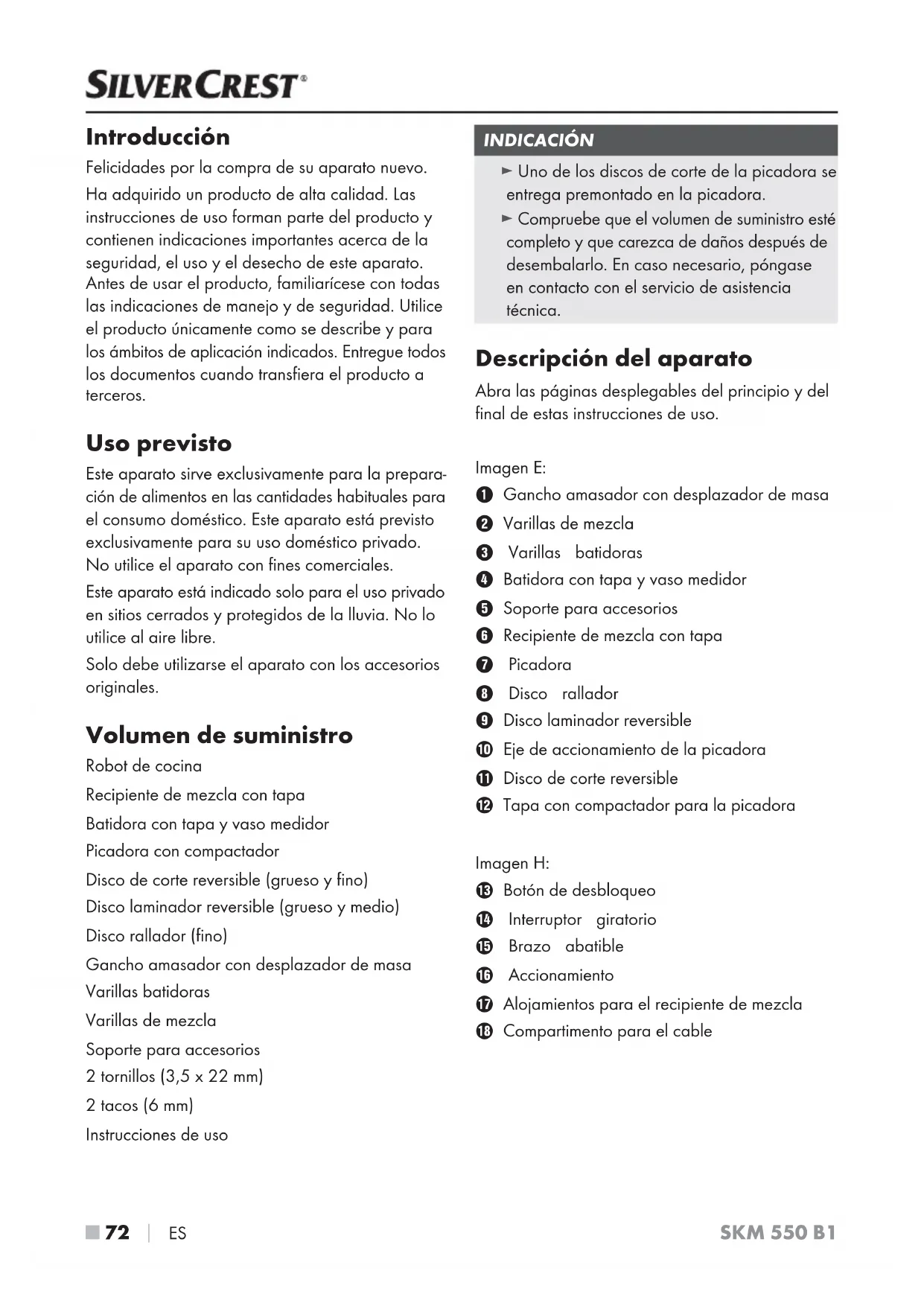 ES SKM 550 B1 Introducción Felicidades por la compra de su aparato nuevo. Ha adquirido un producto de alta calidad. Las instrucciones de uso forman parte del producto y contienen indicaciones importantes acerca de la seguridad, el uso y el desecho de este aparato. Antes de usar el producto, familiarícese con todas las indicaciones de manejo y de seguridad. Utilice el producto únicamente como se describe y para los ámbitos de aplicación indicados. Entregue todos los documentos cuando transfiera el producto a terceros. Uso previsto Este aparato sirve exclusivamente para la prepara- ción de alimentos en las cantidades habituales para el consumo doméstico. Este aparato está previsto exclusivamente para su uso doméstico privado. No utilice el aparato con fines comerciales. Este aparato está indicado solo para el uso privado en sitios cerrados y protegidos de la lluvia. No lo utilice al aire libre. Solo debe utilizarse el aparato con los accesorios originales. Volumen de suministro Robot de cocina Recipiente de mezcla con tapa Batidora con tapa y vaso medidor Picadora con compactador Disco de corte reversible (grueso y fino) Disco laminador reversible (grueso y medio) Disco rallador (fino) Gancho amasador con desplazador de masa Varillas batidoras Varillas de mezcla Soporte para accesorios 2 tornillos (3,5 x 22 mm) 2 tacos (6 mm) Instrucciones de uso INDICACIÓN ► Uno de los discos de corte de la picadora se entrega premontado en la picadora. ► Compruebe que el volumen de suministro esté completo y que carezca de daños después de desembalarlo. En caso necesario, póngase en contacto con el servicio de asistencia técnica. Descripción del aparato Abra las páginas desplegables del principio y del final de estas instrucciones de uso. Imagen E: Gancho amasador con desplazador de masa Varillas de mezcla Varillas batidoras Batidora con tapa y vaso medidor Soporte para accesorios Recipiente de mezcla con tapa Picadora Disco rallador Disco laminador reversible Eje de accionamiento de la picadora - Disco de corte reversible 3 Tapa con compactador para la picadora Imagen H: ! Botón de desbloqueo . Interruptor giratorio 0 Brazo abatible 6 Accionamiento 1 Alojamientos para el recipiente de mezcla % Compartimento para el cableES