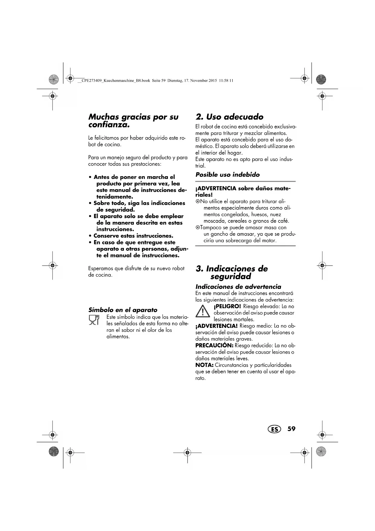 seguridad Indicaciones de advertencia En este manual de instrucciones encontrará las siguientes indicaciones de advertencia: ¡PELIGRO! Riesgo elevado: La no observación del aviso puede causar lesiones mortales. ¡ADVERTENCIA! Riesgo medio: La no ob- servación del aviso puede causar lesiones o daños materiales graves. PRECAUCIÓN: Riesgo reducido: La no ob- servación del aviso puede causar lesiones o daños materiales leves. NOTA: Circunstancias y particularidades que se deben tener en cuenta al usar el apa- rato. __CPE273409_Kuechenmaschine_B8.book Seite 59 Dienstag, 17. November 2015 11:58 1160