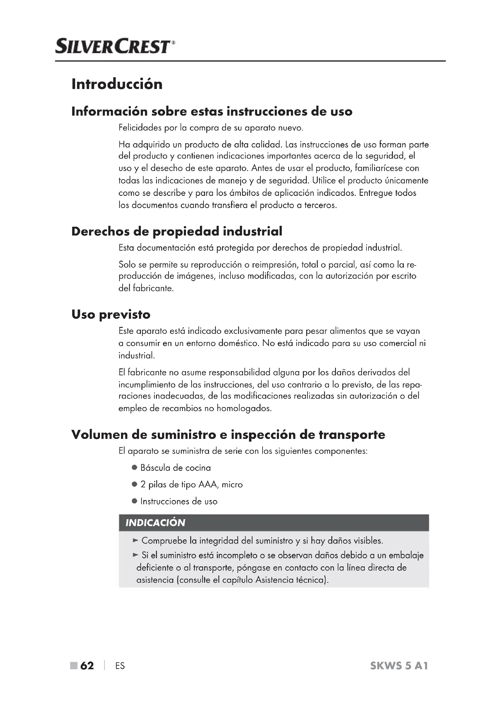 ES SKWS 5 A1 Introducción Información sobre estas instrucciones de uso Felicidades por la compra de su aparato nuevo. Ha adquirido un producto de alta calidad. Las instrucciones de uso forman parte del producto y contienen indicaciones importantes acerca de la seguridad, el uso y el desecho de este aparato. Antes de usar el producto, familiarícese con todas las indicaciones de manejo y de seguridad. Utilice el producto únicamente como se describe y para los ámbitos de aplicación indicados. Entregue todos los documentos cuando transfiera el producto a terceros. Derechos de propiedad industrial Esta documentación está protegida por derechos de propiedad industrial. Solo se permite su reproducción o reimpresión, total o parcial, así como la re- producción de imágenes, incluso modificadas, con la autorización por escrito del fabricante. Uso previsto Este aparato está indicado exclusivamente para pesar alimentos que se vayan a consumir en un entorno doméstico. No está indicado para su uso comercial ni industrial. El fabricante no asume responsabilidad alguna por los daños derivados del incumplimiento de las instrucciones, del uso contrario a lo previsto, de las repa- raciones inadecuadas, de las modificaciones realizadas sin autorización o del empleo de recambios no homologados. Volumen de suministro e inspección de transporte El aparato se suministra de serie con los siguientes componentes: ● Báscula de cocina ● 2 pilas de tipo AAA, micro ● Instrucciones de uso INDICACIÓN ► Compruebe la integridad del suministro y si hay daños visibles. ► Si el suministro está incompleto o se observan daños debido a un embalaje deficiente o al transporte, póngase en contacto con la línea directa de asistencia (consulte el capítulo Asistencia técnica).ES