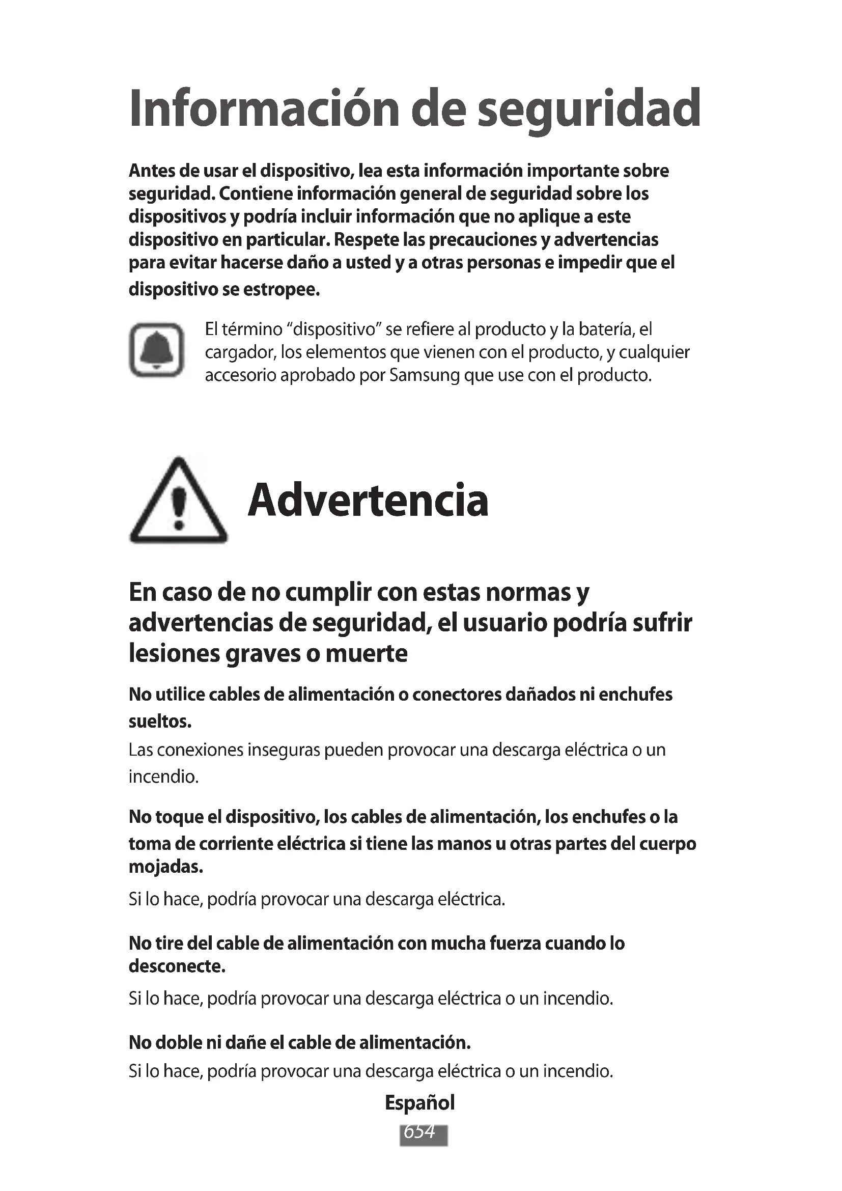 Información de seguridad Antes de usar el dispositivo, lea esta información importante sobre seguridad. Contiene información general de seguridad sobre los dispositivos y podría incluir información que no aplique a este dispositivo en particular. Respete las precauciones y advertencias para evitar hacerse daño a usted y a otras personas e impedir que el dispositivo se estropee.El término “dispositivo” se refiere al producto y la batería, el cargador, los elementos que vienen con el producto, y cualquier accesorio aprobado por Samsung que use con el producto. Advertencia En caso de no cumplir con estas normas y advertencias de seguridad, el usuario podría sufrir lesiones graves o muerte No utilice cables de alimentación o conectores dañados ni enchufes sueltos.Las conexiones inseguras pueden provocar una descarga eléctrica o un incendio.No toque el dispositivo, los cables de alimentación, los enchufes o la toma de corriente eléctrica si tiene las manos u otras partes del cuerpo mojadas.Si lo hace, podría provocar una descarga eléctrica.No tire del cable de alimentación con mucha fuerza cuando lo desconecte.Si lo hace, podría provocar una descarga eléctrica o un incendio.No doble ni dañe el cable de alimentación.Si lo hace, podría provocar una descarga eléctrica o un incendio.Español