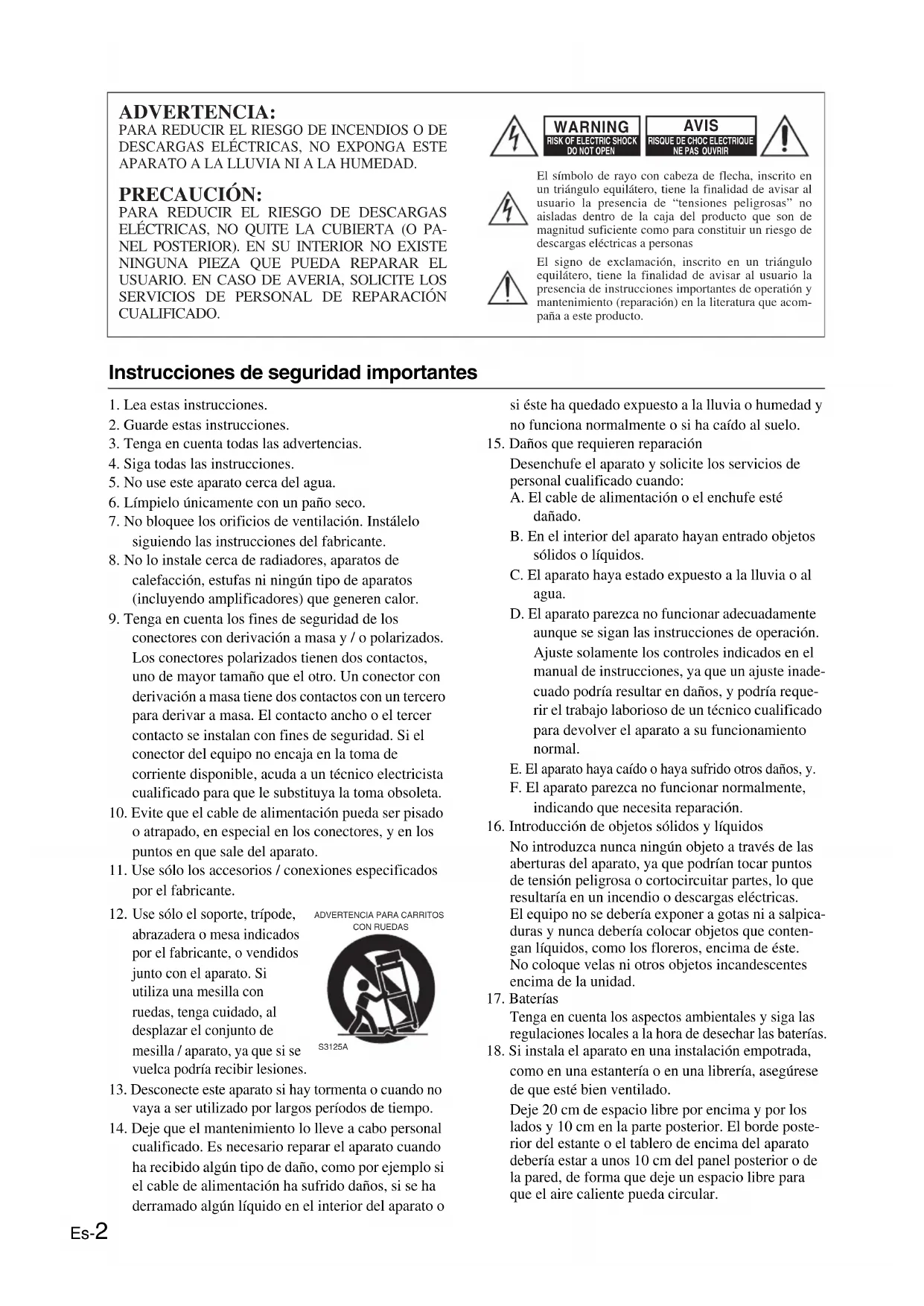 CON RUEDAS S3125AEs-3 Precauciones 1. Copyright de las grabaciones—A menos que se utilice de forma exclusivamente personal, la grabación de material sujeto a copyright es ilegal sin el permiso del propietario del copyright.2. Fusible de CA—El fusible de CA se encuentra en el interior de la unidad y no es un elemento accesible al usuario. Si todavía no puede activar la unidad, póngase en contacto con su distribuidor Onkyo.3. Mantenimiento—De vez en cuando limpie esta unidad con un paño suave. Para la suciedad más difícil de eliminar, use un paño suave ligeramente humedecido con una solución de agua y detergente suave. A continuación, seque la unidad inmediatamente con un paño limpio. No use paños abrasivos, alcohol, ni disolventes químicos de ningún tipo ya que con ellos podría dañar el acabado de la unidad e incluso borrar la serigrafía del panel.4. AlimentaciónATENCIÓNANTES DE CONECTAR LA UNIDAD POR PRIMERA VEZ, LEA CON ATENCIÓN LA SECCIÓN SIGUIENTE.Los voltajes de las tomas de CA varían para cada país. Compruebe que el voltaje de su zona cumpla con los requisitos de voltaje indicados en la etiqueta de características que se encuentra en el panel posterior de esta unidad (por ejemplo, AC 230 V, 50 Hz o AC 120 V, 60 Hz).El cable de alimentación se utiliza para desconectar esta unidad de la fuente de alimentación de CA. Asegúrese de que el conector esté siempre operativo (fácilmente accesible).Al pulsar el botón [ON/STANDBY] para seleccionar el modo Standby, el equipo no se desactiva completamente. Si no tiene previsto utilizar la unidad durante un periodo de tiempo prolongado, desconecte el cable de alimentación de la toma CA.5. Evitar pérdidas auditivas PrecauciónUna presión de sonido excesiva de los auriculares de botón y de los auriculares de cabeza puede causar pérdidas auditivas.6. Baterías y exposición al calor AvisoLas baterías (paquete de baterías o baterías instaladas) no deben exponerse a un calor excesivo como los rayos del sol, fuego o similar.7. Nunca toque esta unidad con las manos húmedas—Nunca utilice esta unidad ni su cable de alimentación si tiene las manos húmedas o mojadas. Si penetra agua o algún otro líquido en el interior de esta unidad, hágalo revisar por su distribuidor Onkyo.8. Notas acerca del manejo de la unidad• Si tiene que transportar esta unidad, use el emba-laje original para empaquetarlo de la misma forma en que estaba empaquetado originalmente al adquirirlo.• No deje por mucho tiempo objetos de plástico o goma sobre esta unidad ya que, con el tiempo, podrían dejar marcas en la superficie.• Después de un uso prolongado, es posible que los paneles superior y posterior de esta unidad se calienten. Esto es normal.• Si no va a usar esta unidad por un largo período de tiempo, es posible que al activarla de nuevo no funcione correctamente, por lo que es aconsejable que la utilice de vez en cuando. Para los modelos europeos Declaración de Conformidad Nosotros, de ONKYO EUROPE ELECTRONICS GmbH LIEGNITZERSTRASSE 6, 82194 GROEBENZELL, ALEMANIAGROEBENZELL, ALEMANIAONKYO EUROPE ELECTRONICS GmbHdeclaramos, bajo nuestra propia responsabilidad, que el producto de ONKYO que se describe en el presente manual de instrucciones cumple con las normas técnicas EN60065, EN55013, EN55020 y EN61000-3-2, -3-3.K. MIYAGIEs-4 Accesorios suministrados Asegúrese de que dispone de los siguientes accesorios: