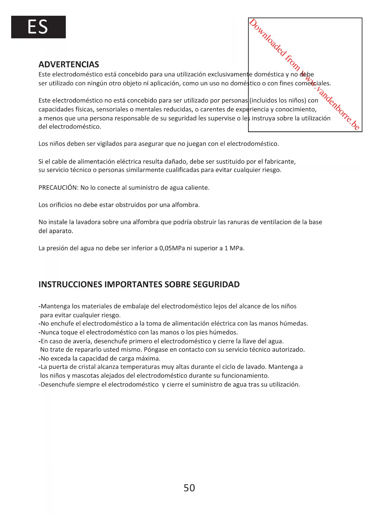 62Downloaded from www.vandenborre.be ADVERTENCIAS Este electrodoméstico está concebido para una utilización exclusivamente doméstica y no debe ser utilizado con ningún otro objeto ni aplicación, como un uso no doméstico o con fines comerciales. Este electrodoméstico no está concebido para ser utilizado por personas (incluidos los niños) con capacidades físicas, sensoriales o mentales reducidas, o carentes de experiencia y conocimiento, a menos que una persona responsable de su seguridad les supervise o les instruya sobre la utilización del electrodoméstico. Los niños deben ser vigilados para asegurar que no juegan con el electrodoméstico. Si el cable de alimentación eléctrica resulta dañado, debe ser sustituido por el fabricante, su servicio técnico o personas similarmente cualificadas para evitar cualquier riesgo. PRECAUCIÓN: No lo conecte al suministro de agua caliente.
