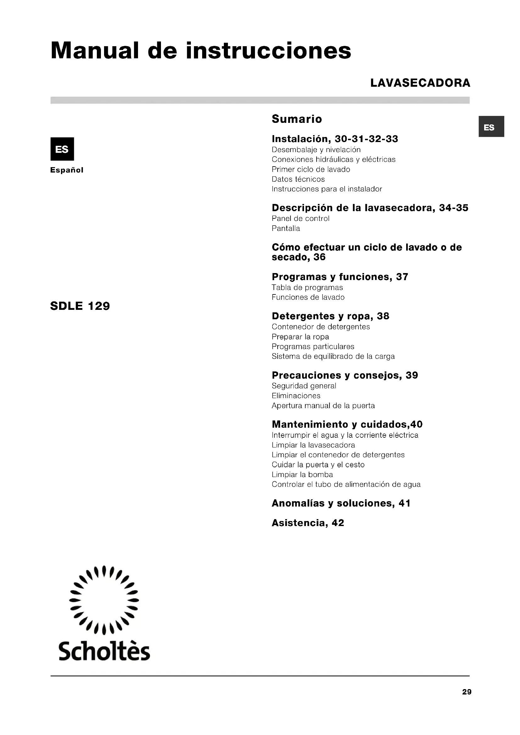 Español Sumario Instalación, 30-31-32-33 Desembalaje y nivelación Conexiones hidráulicas y eléctricas Primer ciclo de lavado Datos técnicos Instrucciones para el instalador Descripción de la lavasecadora, 34-35 Panel de control Pantalla Cómo efectuar un ciclo de lavado o de secado, 36 Programas y funciones, 37 Tabla de programas Funciones de lavado Detergentes y ropa, 38 Contenedor de detergentes Preparar la ropa Programas particulares Sistema de equilibrado de la carga Precauciones y consejos, 39 Seguridad general Eliminaciones Apertura manual de la puerta Mantenimiento y cuidados,40 Interrumpir el agua y la corriente eléctrica Limpiar la lavasecadora Limpiar el contenedor de detergentes Cuidar la puerta y el cesto Limpiar la bomba Controlar el tubo de alimentación de agua Anomalías y soluciones, 41 Asistencia, 42