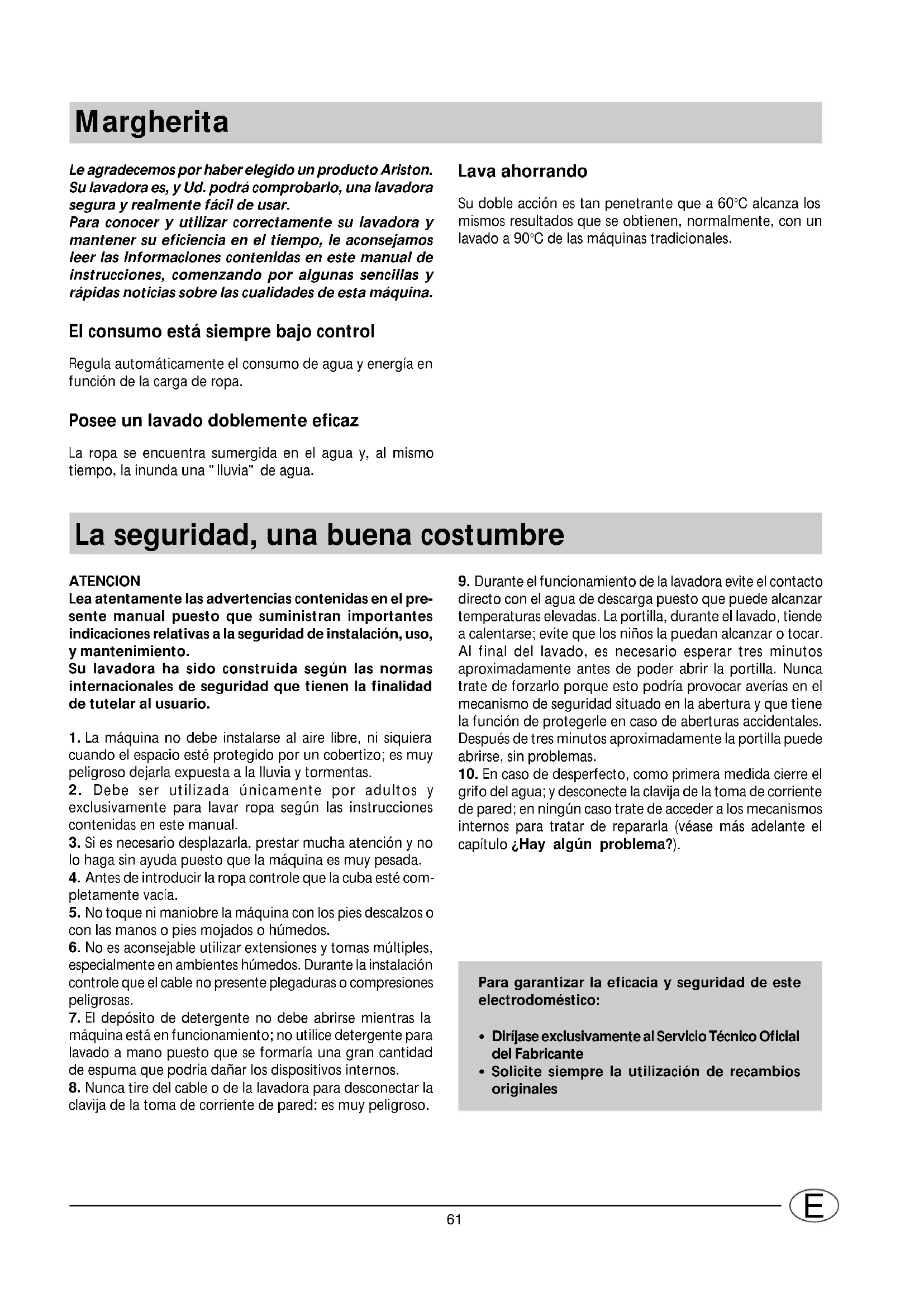 Le agradecemos por haber elegido un producto Ariston. Su lavadora es, y Ud. podrá comprobarlo, una lavadora segura y realmente fácil de usar. Para conocer y utilizar correctamente su lavadora y mantener su eficiencia en el tiempo, le aconsejamos leer las informaciones contenidas en este manual de instrucciones, comenzando por algunas sencillas y rápidas noticias sobre las cualidades de esta máquina. El consumo está siempre bajo control Regula automáticamente el consumo de agua y energía en función de la carga de ropa. Posee un lavado doblemente eficaz La ropa se encuentra sumergida en el agua y, al mismo tiempo, la inunda una "lluvia" de agua. La seguridad, una buena costumbre ATENCION Lea atentamente las advertencias contenidas en el pre- sente manual puesto que suministran importantes indicaciones relativas a la seguridad de instalación, uso, y mantenimiento. Su lavadora ha sido construida según las normas internacionales de seguridad que tienen la finalidad de tutelar al usuario.