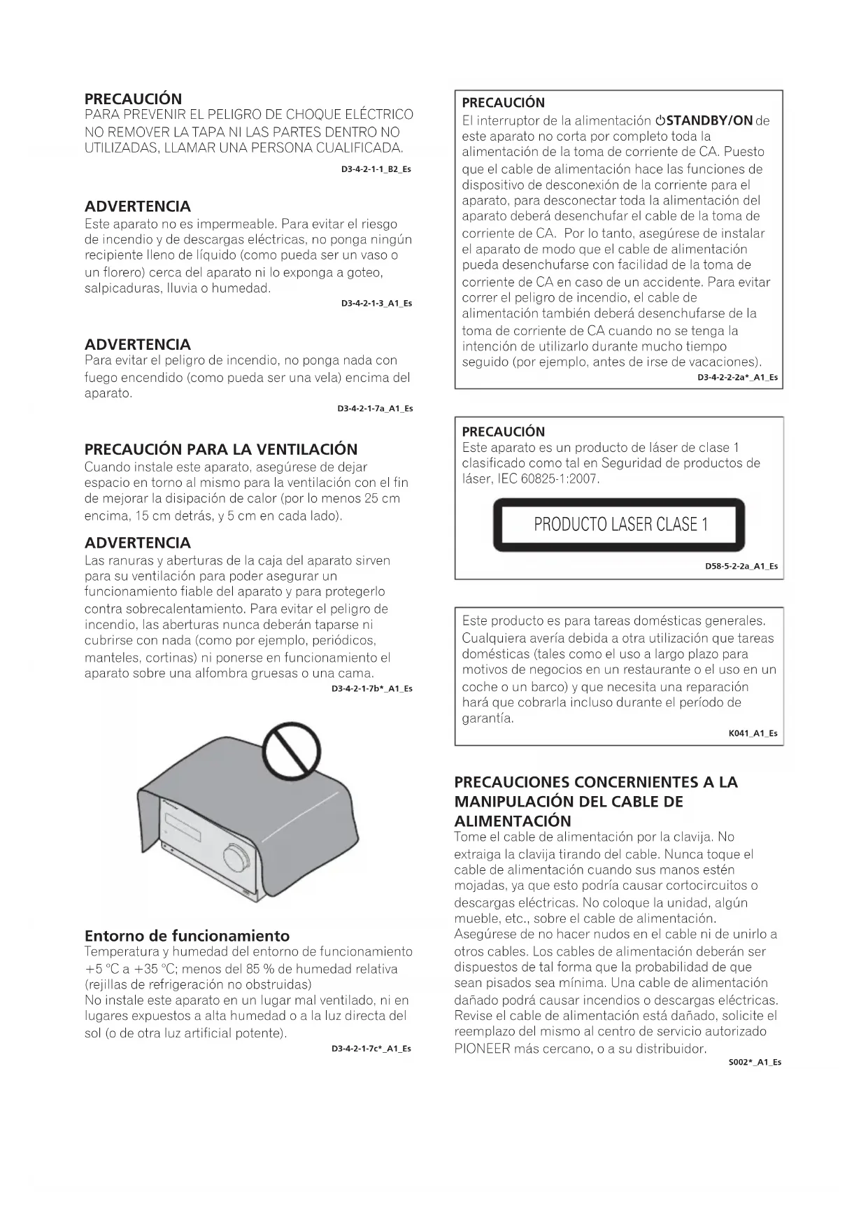 ALIMENTACIÓN Tome el cable de alimentación por la clavija. No extraiga la clavija tirando del cable. Nunca toque el cable de alimentación cuando sus manos estén mojadas, ya que esto podría causar cortocircuitos o descargas eléctricas. No coloque la unidad, algún mueble, etc., sobre el cable de alimentación. Asegúrese de no hacer nudos en el cable ni de unirlo a otros cables. Los cables de alimentación deberán ser dispuestos de tal forma que la probabilidad de que sean pisados sea mínima. Una cable de alimentación dañado podrá causar incendios o descargas eléctricas. Revise el cable de alimentación está dañado, solicite el reemplazo del mismo al centro de servicio autorizado PIONEER más cercano, o a su distribuidor. S002*_A1_Es PRECAUCIÓN El interruptor de la alimentación STANDBY/ON