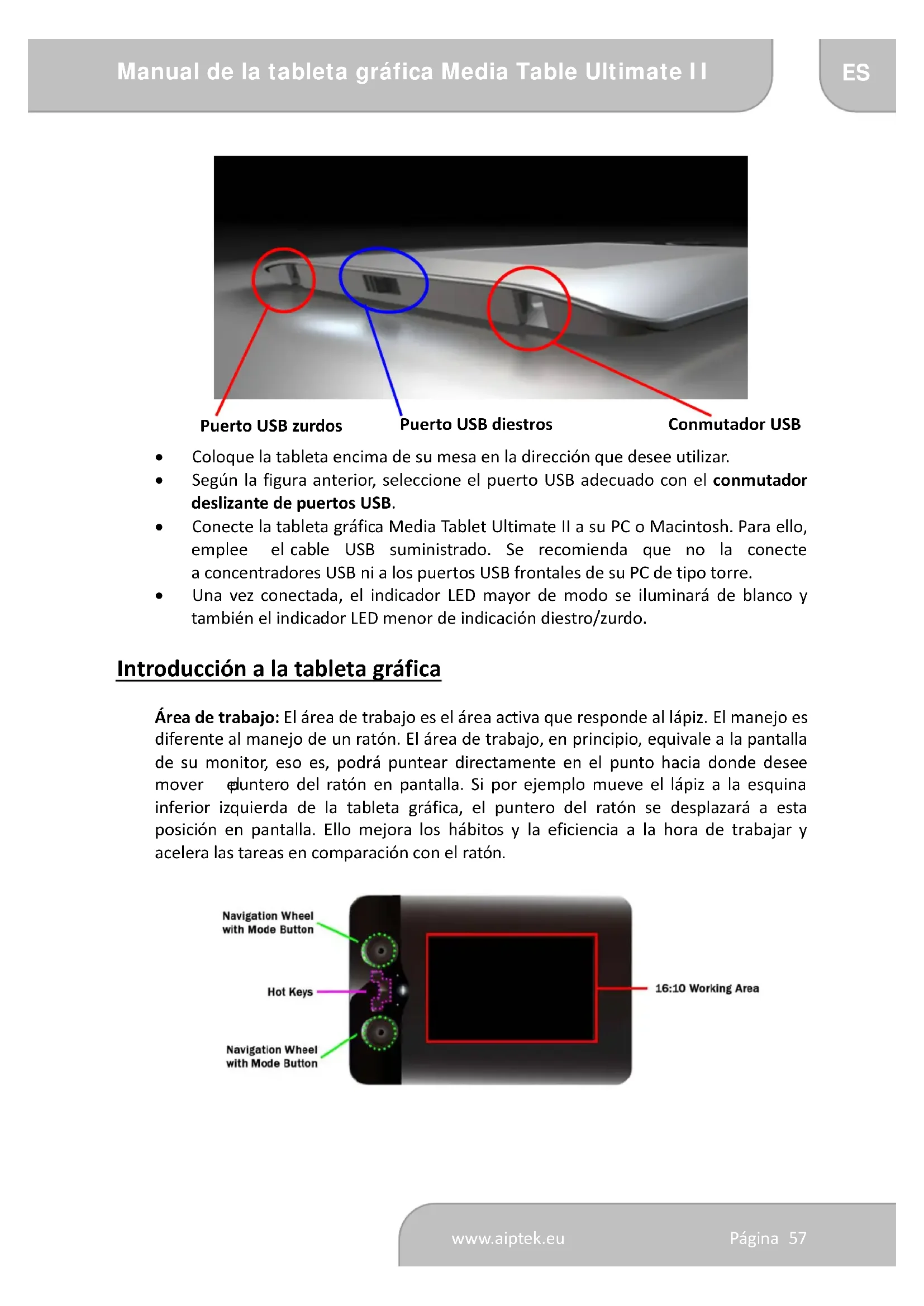 La tableta gráficamultimedia ha sidodiseñadatanto paralos usuarios diestroscomo para los zurdos. Para distinguir mejor estos dos modos operativos, la tableta multimediaUltimateIIllevadospuertosUSB,unoparacadaorientación.Esnecesario utilizarelpuertoUSBadecuadoparaelmodooperativoquedeseeemplear.Manual de la tableta gráfica Media Table Ultimate II www.aiptek.eu Página 57