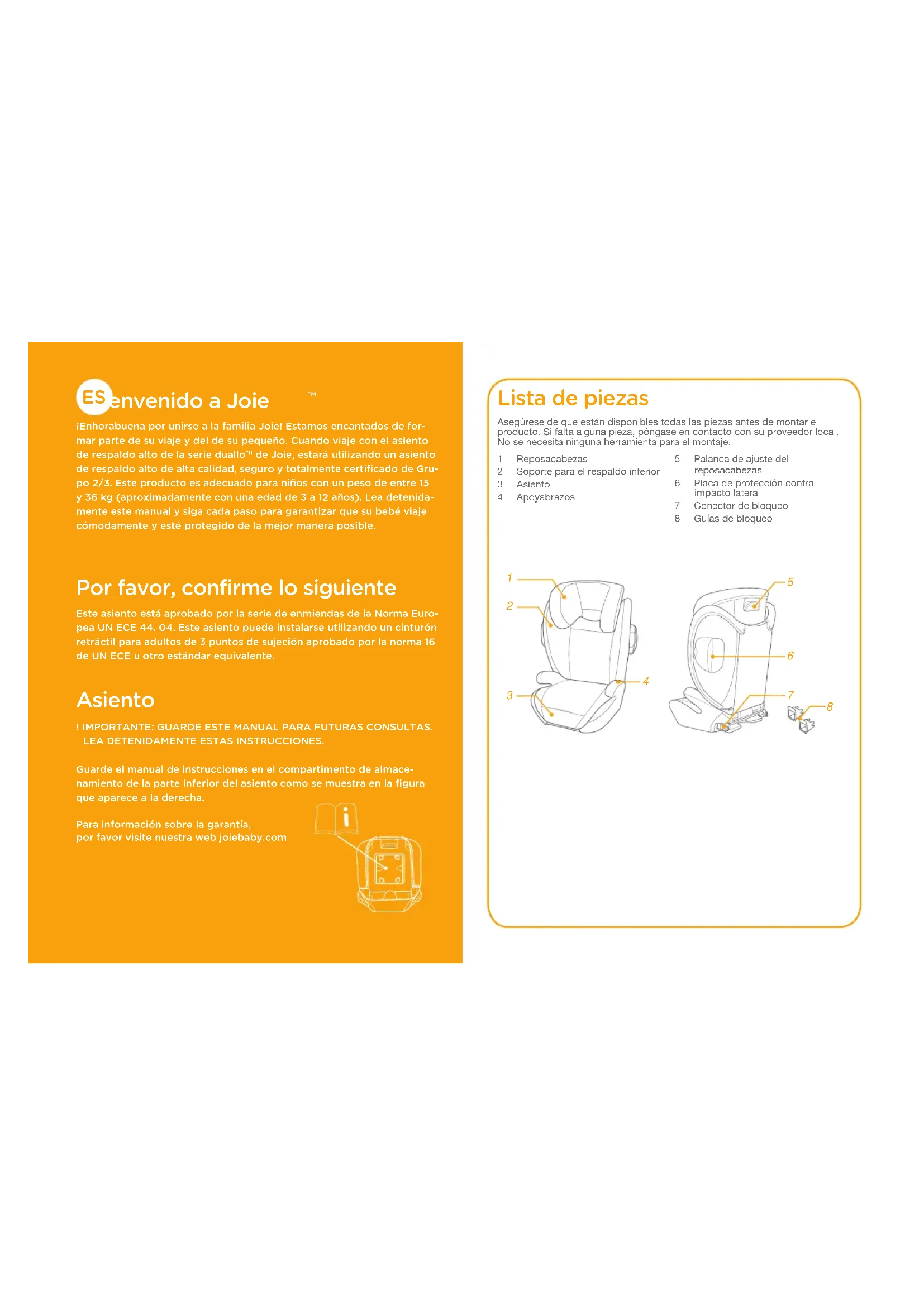 ¡Enhorabuena por unirse a la familia Joie! Estamos encantados de for-mar parte de su viaje y del de su pequeño. Cuando viaje con el asiento de respaldo alto de la serie duallo™ de Joie, estará utilizando un asiento de respaldo alto de alta calidad, seguro y totalmente certificado de Gru-po 2/3. Este producto es adecuado para niños con un peso de entre 15 y 36 kg (aproximadamente con una edad de 3 a 12 años). Lea detenida-mente este manual y siga cada paso para garantizar que su bebé viaje cómodamente y esté protegido de la mejor manera posible. Por favor, confirme lo siguiente Este asiento está aprobado por la serie de enmiendas de la Norma Euro-pea UN ECE 44. 04. Este asiento puede instalarse utilizando un cinturón retráctil para adultos de 3 puntos de sujeción aprobado por la norma 16 de UN ECE u otro estándar equivalente. Asiento ! IMPORTANTE: GUARDE ESTE MANUAL PARA FUTURAS CONSULTAS. LEA DETENIDAMENTE ESTAS INSTRUCCIONES.Guarde el manual de instrucciones en el compartimento de almace-namiento de la parte inferior del asiento como se muestra en la figura que aparece a la derecha.Para información sobre la garantía, por favor visite nuestra web joiebaby.com