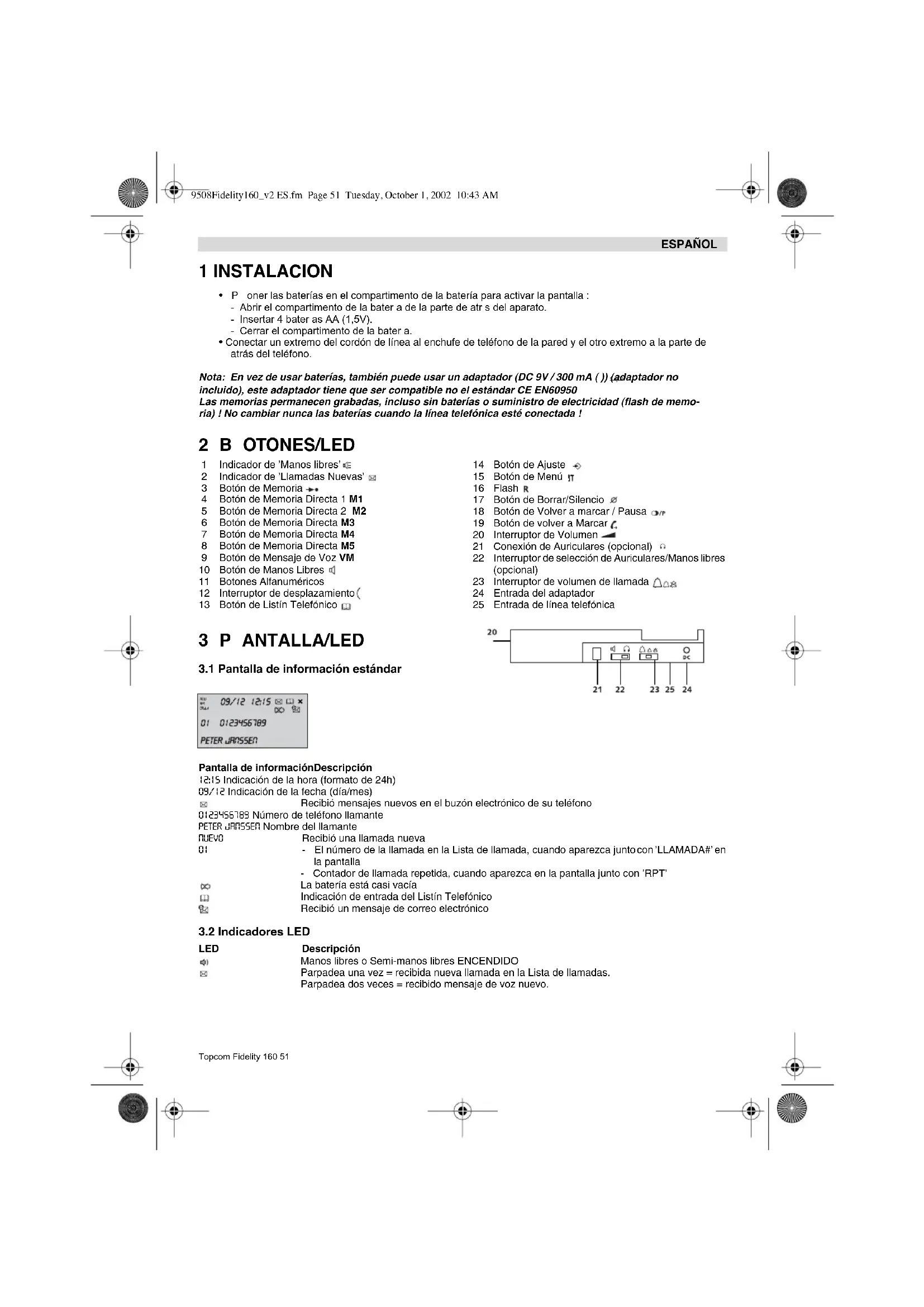 LED Descripción Manos libres o Semi-manos libres ENCENDIDO Parpadea una vez = recibida nueva llamada en la Lista de llamadas. Parpadea dos veces = recibido mensaje de voz nuevo. 1 Indicador de ’Manos libres’ 2 Indicador de ’Llamadas Nuevas’ 3 Botón de Memoria 4 Botón de Memoria Directa 1 M1 5 Botón de Memoria Directa 2 M2 6 Botón de Memoria Directa M3 7 Botón de Memoria Directa M4 8 Botón de Memoria Directa M5 9 Botón de Mensaje de Voz VM 10 Botón de Manos Libres 11 Botones Alfanuméricos 12 Interruptor de desplazamiento 13 Botón de Listín Telefónico 14 Botón de Ajuste 15 Botón de Menú 16 Flash 17 Botón de Borrar/Silencio 18 Botón de Volver a marcar / Pausa 19 Botón de volver a Marcar 20 Interruptor de Volumen 21 Conexión de Auriculares (opcional) 22 Interruptor de selección de Auriculares/Manos libres (opcional) 23 Interruptor de volumen de llamada 24 Entrada del adaptador 25 Entrada de línea telefónica 9508Fidelity160_v2 ES.fm Page 51 Tuesday, October 1, 2002 10:43 AM52 Topcom Fidelity 160 ESPAÑOL 4 FUNCIONAMIENTO