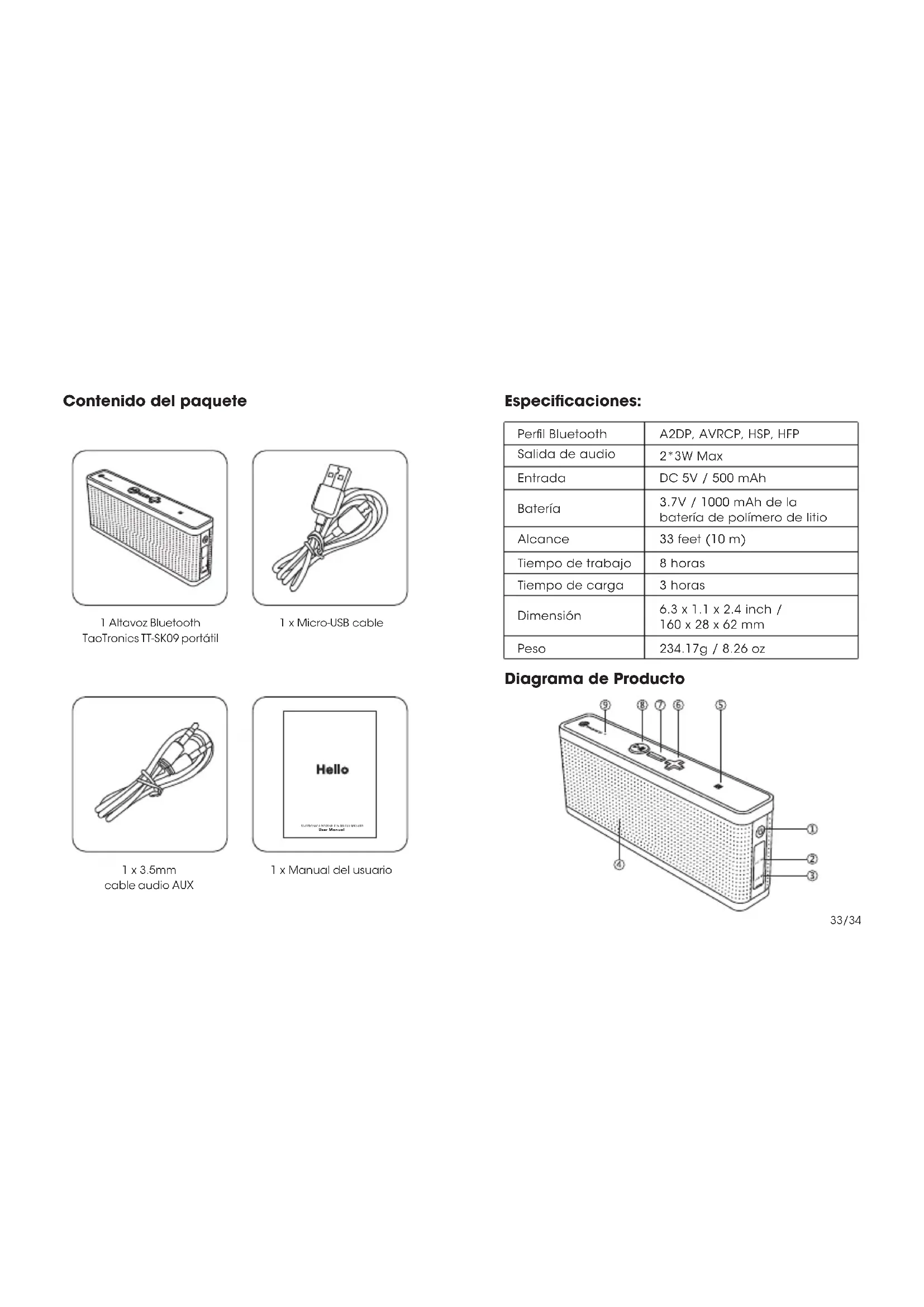 User Manual 1 Altavoz Bluetooth TaoTronics TT-SK09 portátil 1 x Micro-USB cable 1 x 3.5mm cable audio AUX 1 x Manual del usuario Diagrama de Producto Especicaciones: Perl Bluetooth Salida de audio Entrada Batería Alcance Tiempo de trabajo Tiempo de carga Dimensión Peso