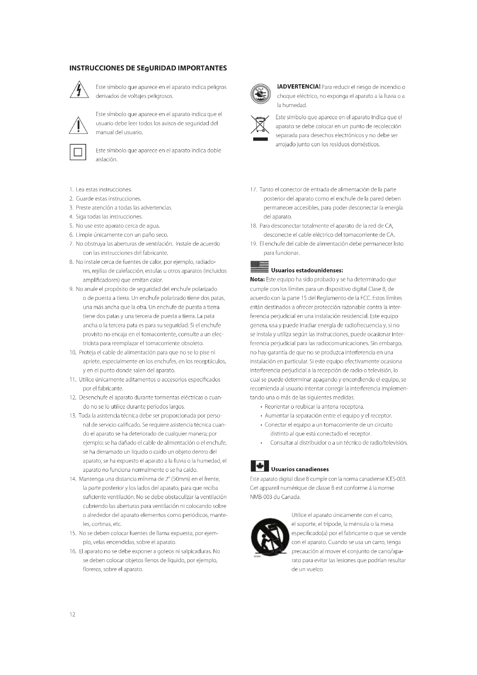 para funcionar. Usuarios estadounidenses: Nota: Este equipo ha sido probado y se ha determinado que cumple con los límites para un dispositivo digital Clase B, de acuerdo con la parte 15 del Reglamento de la FCC. Estos límites están destinados a ofrecer protección razonable contra la inter- ferencia perjudicial en una instalación residencial. Este equipo genera, usa y puede irradiar energía de radiofrecuencia y, si no se instala y utiliza según las instrucciones, puede ocasionar inter- ferencia perjudicial para las radiocomunicaciones. Sin embargo, no hay garantía de que no se produzca interferencia en una instalación en particular. Si este equipo efectivamente ocasiona interferencia perjudicial a la recepción de radio o televisión, lo cual se puede determinar apagando y encendiendo el equipo, se recomienda al usuario intentar corregir la interferencia implemen- tando una o más de las siguientes medidas.