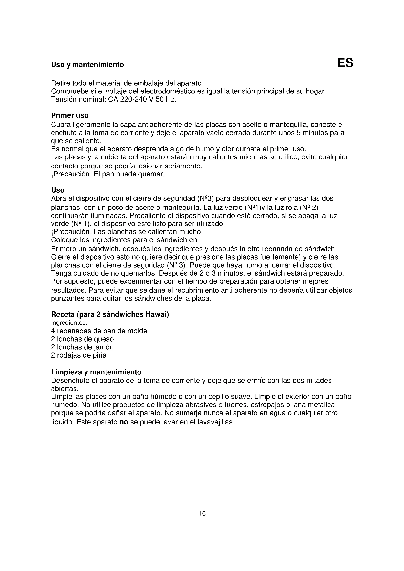 Verpackung Die Verpackung ist zu 100 % recycelbar, geben Sie die Verpackung getrennt zurück. Produkt Dieses Gerät ist mit einem Kennzeichen gemäß der Europäischen Richtlinie 2002/96/EG für Elektro- und Elektronik-Altgeräte (WEEE) ausgestattet. Durch die Sicherstellung, dass das Produkt korrekt als Abfall entsorgt wird, helfen Sie, die negativen Auswirkungen für die Umwelt und die menschliche Gesundheit zu minimieren. EU-Konformitätserklärung Dieses Gerät wurde gemäß der Sicherheitsziele der EG-Niederspannungsrichtlinie 2006/95/EG, der Sicherheitsanforderungen der EMV-Richtlinie 2004/108/EG „Elektromagnetischer Kompatibilität“ und der Erfordernisse der Richtlinie 93/68/EWG entwickelt, hergestellt und vertrieben.16 Uso y mantenimiento ES Retire todo el material de embalaje del aparato. Compruebe si el voltaje del electrodoméstico es igual la tensión principal de su hogar. Tensión nominal: CA 220-240 V 50 Hz. Primer uso Cubra ligeramente la capa antiadherente de las placas con aceite o mantequilla, conecte el enchufe a la toma de corriente y deje el aparato vacío cerrado durante unos 5 minutos para que se caliente. Es normal que el aparato desprenda algo de humo y olor durnate el primer uso. Las placas y la cubierta del aparato estarán muy calientes mientras se utilice, evite cualquier contacto porque se podría lesionar seriamente. ¡Precaución! El pan puede quemar. Uso Abra el dispositivo con el cierre de seguridad (Nº3) para desbloquear y engrasar las dos planchas con un poco de aceite o mantequilla. La luz verde (Nº1)y la luz roja (Nº 2) continuarán iluminadas. Precaliente el dispositivo cuando esté cerrado, si se apaga la luz verde (Nº 1), el dispositivo esté listo para ser utilizado. ¡Precaución! Las planchas se calientan mucho. Coloque los ingredientes para el sándwich en Primero un sándwich, después los ingredientes y después la otra rebanada de sándwich Cierre el dispositivo esto no quiere decir que presione las placas fuertemente) y cierre las planchas con el cierre de seguridad (Nº 3). Puede que haya humo al cerrar el dispositivo. Tenga cuidado de no quemarlos. Después de 2 o 3 minutos, el sándwich estará preparado. Por supuesto, puede experimentar con el tiempo de preparación para obtener mejores resultados. Para evitar que se dañe el recubrimiento anti adherente no debería utilizar objetos punzantes para quitar los sándwiches de la placa. Receta (para 2 sándwiches Hawai) Ingredientes: 4 rebanadas de pan de molde 2 lonchas de queso 2 lonchas de jamón 2 rodajas de piña Limpieza y mantenimiento Desenchufe el aparato de la toma de corriente y deje que se enfríe con las dos mitades abiertas. Limpie las places con un paño húmedo o con un cepillo suave. Limpie el exterior con un paño húmedo. No utilice productos de limpieza abrasives o fuertes, estropajos o lana metálica porque se podría dañar el aparato. No sumerja nunca el aparato en agua o cualquier otro líquido. Este aparato no se puede lavar en el lavavajillas.17 PRECAUCIONES IMPORTANTES