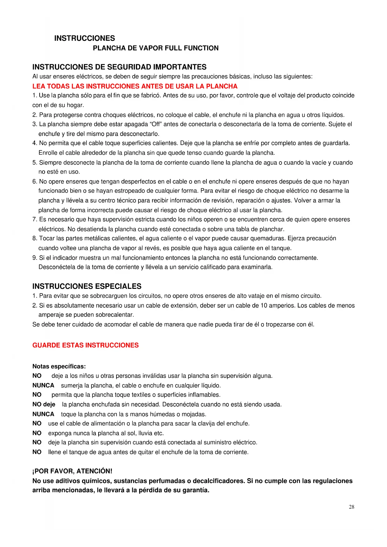 Al usar enseres eléctricos, se deben de seguir siempre las precauciones básicas, incluso las siguientes: LEA TODAS LAS INSTRUCCIONES ANTES DE USAR LA PLANCHA 1. Use la plancha sólo para el fin que se fabricó. Antes de su uso, por favor, controle que el voltaje del producto coincide con el de su hogar.