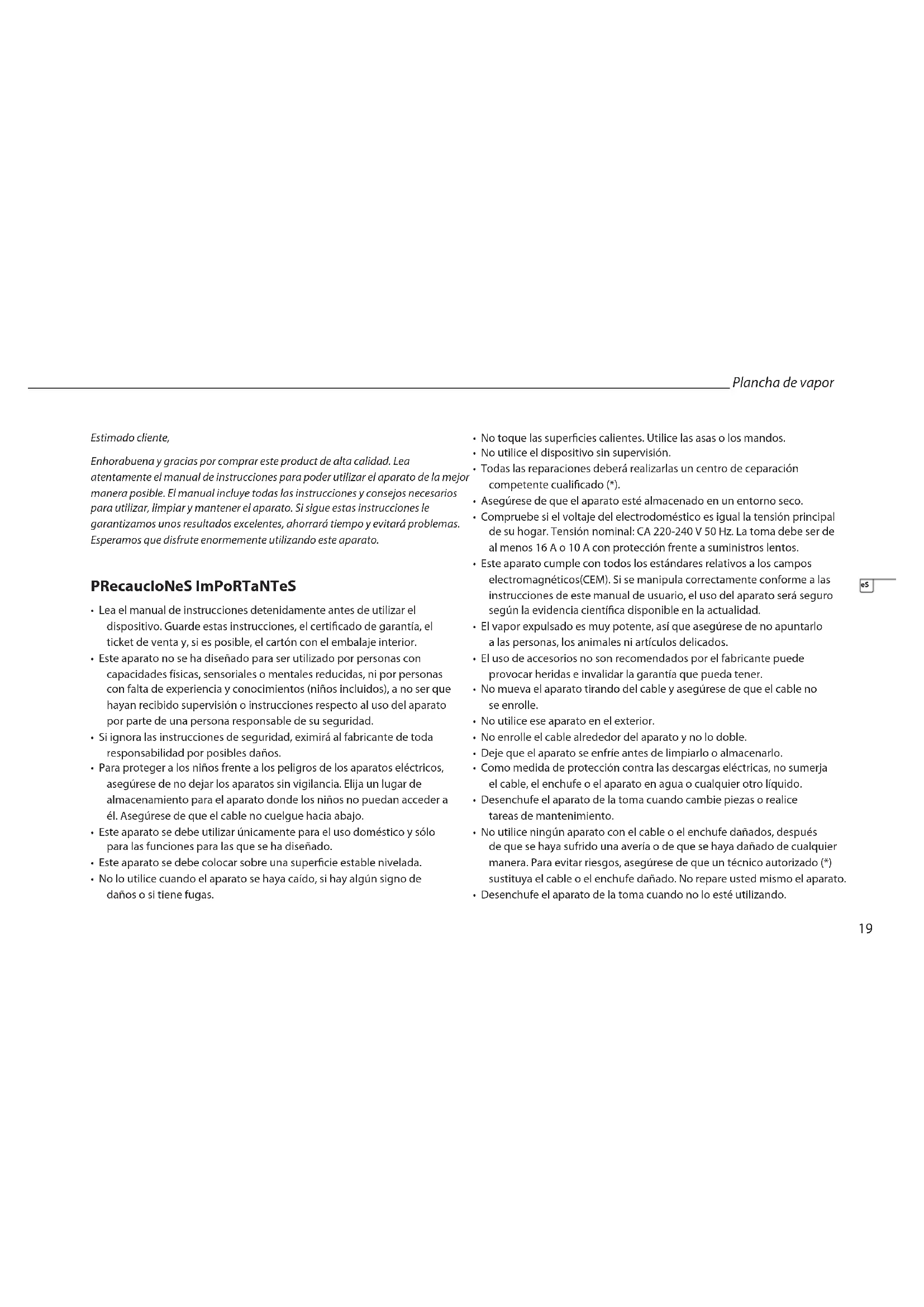 - Este aparato cumple con todos los estándares relativos a los campos electromagnéticos(CEM). Si se manipula correctamente conforme a las instrucciones de este manual de usuario, el uso del aparato será seguro según la evidencia cientíca disponible en la actualidad.