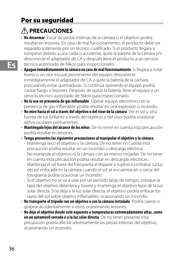 • Apague inmediatamente la cámara en caso de mal funcionamiento. Si llegara a notar humo o un olor inusual proveniente del equipo, desconecte inmediatamente el adaptador de CA y quite la batería de la cámara, procurando evitar quemaduras. Si continúa operando el equipo podría causar fuego o lesiones. Después de quitar la batería, lleve el equipo a un servicio técnico autorizado de Nikon para inspeccionarlo. • No lo use en presencia de gas inflamable. Operar equipo electrónico en la presencia de gas inflamable podría resultar en una explosión o incendio. • No mire hacia el sol a través del objetivo o del visor de la cámara. Ver el sol u otra fuente de luz brillante a través del objetivo o del visor podría ocasionar daños oculares permanentes. • Manténgalo lejos del alcance de los niños. De no tener en cuenta esta precaución podría resultar en lesiones. • Tenga presentes las siguientes precauciones al manipular el objetivo y la cámara: - Mantenga seco el objetivo y la cámara. De no tener en cuenta esta precaución podría resultar en un incendio o descarga eléctrica. - No manipule el objetivo ni la cámara con las manos mojadas. De no tener en cuenta esta precaución podría resultar en descargas eléctricas. - Mantenga el sol fuera del fotograma al disparar a sujetos a contraluz. La luz del sol enfocada en la cámara cuando el sol se encuentra en o cerca del fotograma podría ocasionar un incendio. - Si el objetivo no se va a usar por un periodo largo de tiempo, coloque la tapa del objetivo delantera y trasera y mantenga el objetivo lejos de la luz solar directa. Si lo deja a la luz solar directa, el objetivo podría enfocar los rayos del sol sobre objetos inflamables, ocasionando un incendio. • No transporte el trípode con un objetivo o con la cámara instalada. Podría caerse o golpear accidentalmente a otros, ocasionando lesiones. • No deje el objetivo donde esté expuesto a temperaturas extremadamente altas, como en un automóvil cerrado o a la luz solar directa. De no tener presente esta precaución podría afectar adversamente las piezas internas del objetivo, ocasionando un incendio.